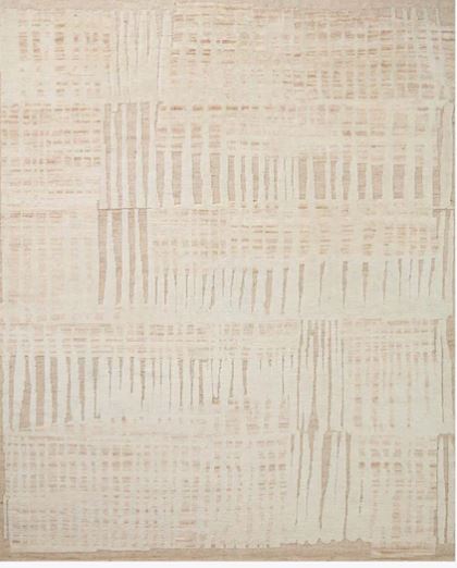 The Moore Collection for Carrier and Company x Loloi is a sophisticated area rug with a subtle interplay of higher, lighter tone pile above a deeper-toned base pile. Abstract geometric patterns in airy, neutral palettes create a sense of freshness and textured dimension that the design firm is known for, especially against the rug's striped base. Hand-knotted of wool and cotton for softness and durability, Moore is also GoodWeave certified, ensuring our commitment to ethical production and the support of weavers' communities. Made in India.