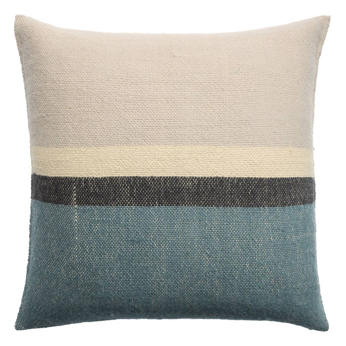 Neem & Jaipur Living present the Margosa collection, offering stonewashed and embroidered handcrafted throws, blankets, and bedding expertly crafted of soft cotton and hand-spun wool in India. Grounded in ancient textile traditions, this collection brings natural designs and textures through indigenous techniques, nature-inspired colors, and raw fibers. The 100% wool Belinda pillow features blue, black, cream, and tan stripes with charming accent buttons.