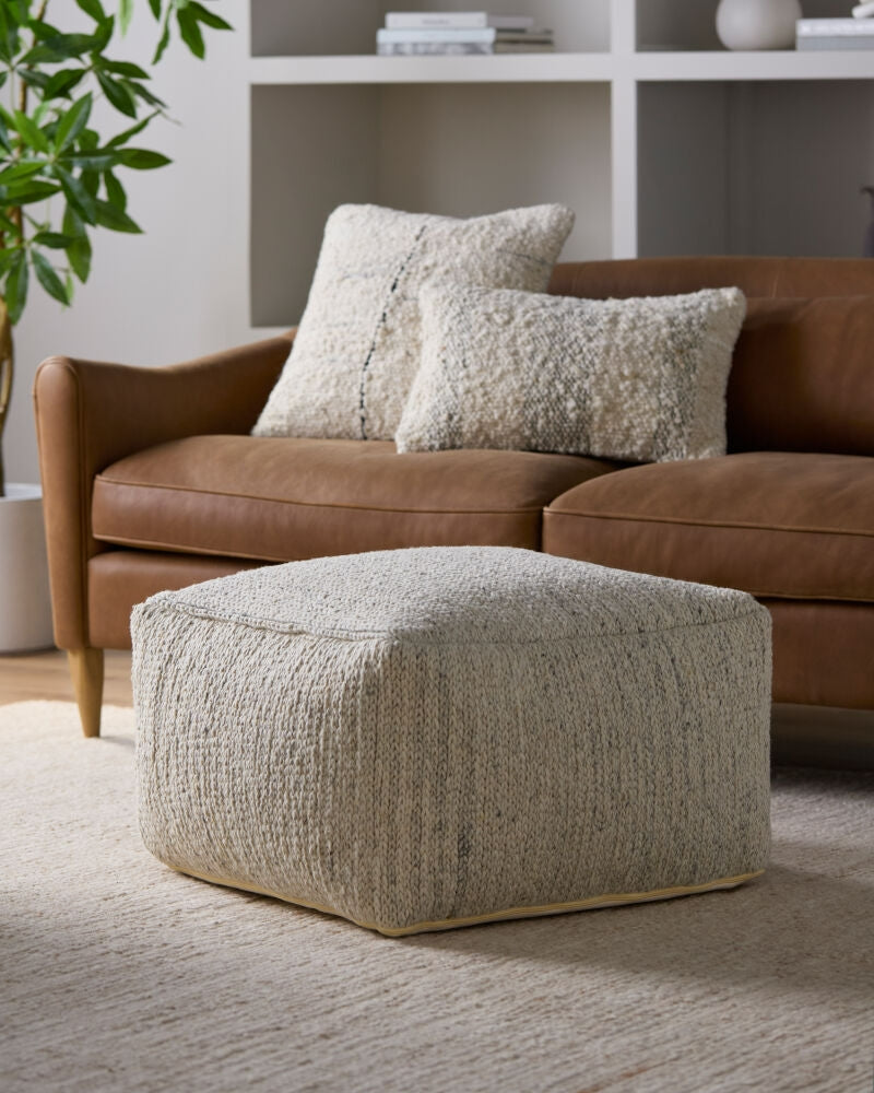 Introducing our Derby collection pouf, a stunning addition to any living space. This chic and versatile piece is manufactured in India and features a stylish wool top that adds an element of sophistication to your decor. The durable cotton bottom ensures longevity while the polybeads filling guarantees maximum comfort. Use it as a footrest, extra seating or even as a decorative accent - this pouf is designed for versatility! And when it needs freshening up, simply spot clean with water. With the Derby pouf, functionality meets style effortlessly.