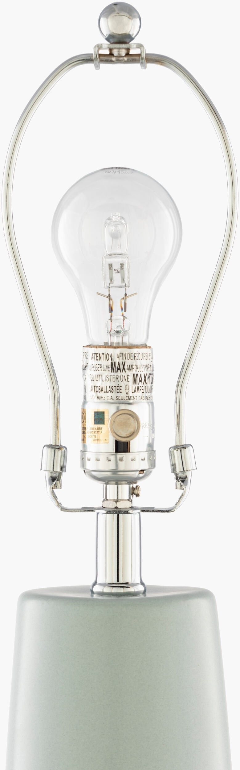 • Color(s): Body: Pale Blue, Cream Base: Clear Finial: Metallic - Nickel Harp: Metallic - Nickel Cord: Translucent