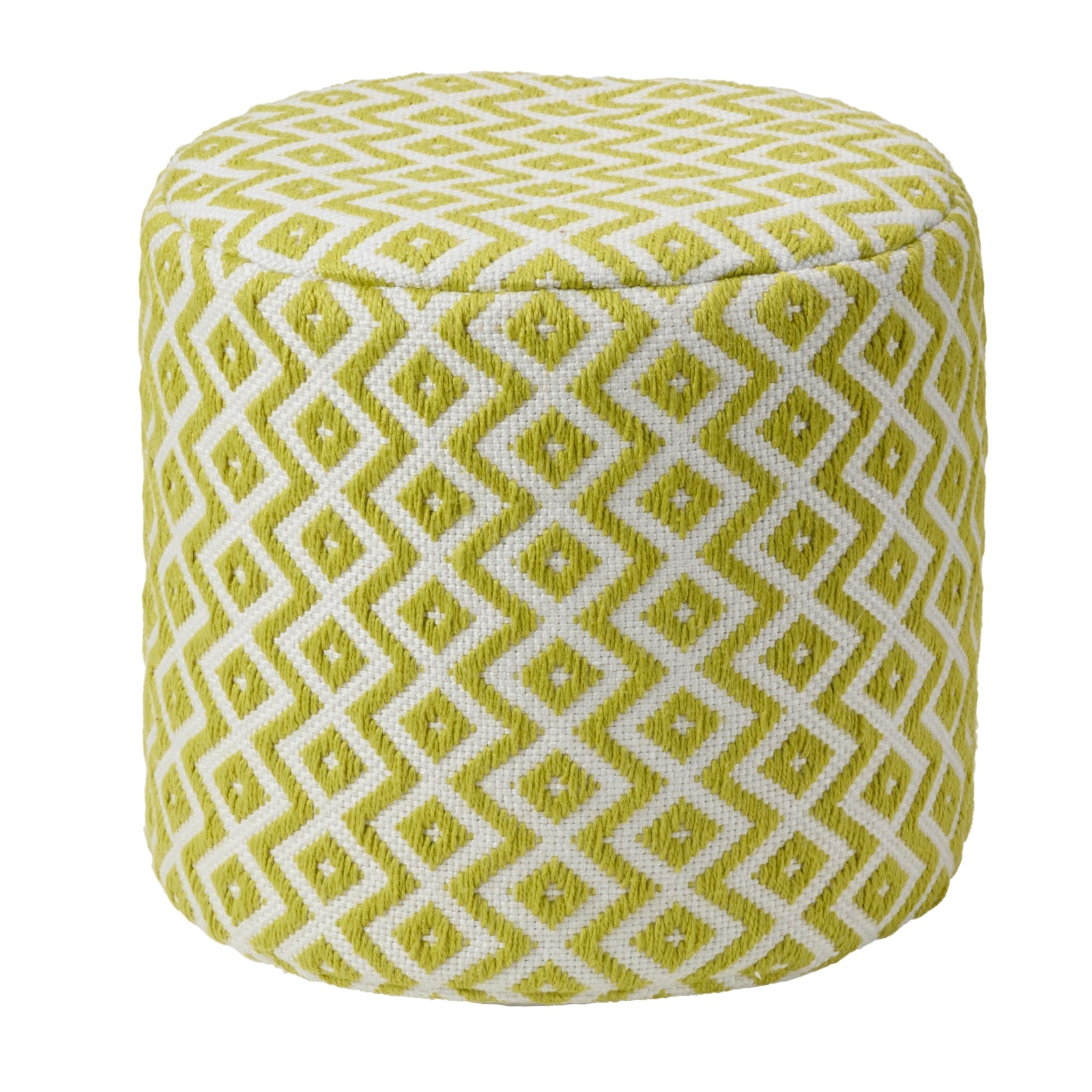 The globally inspired Lenon pouf collection offers chic decor and seating accents to contemporary spaces. The Osbourne design delights with a chevron pattern in a lively chartreuse and ivory colorway. Featuring a durable woven texture and weather-resistant quality, these cylinder poufs provide extra seating or footrests to both indoor and outdoor areas.
