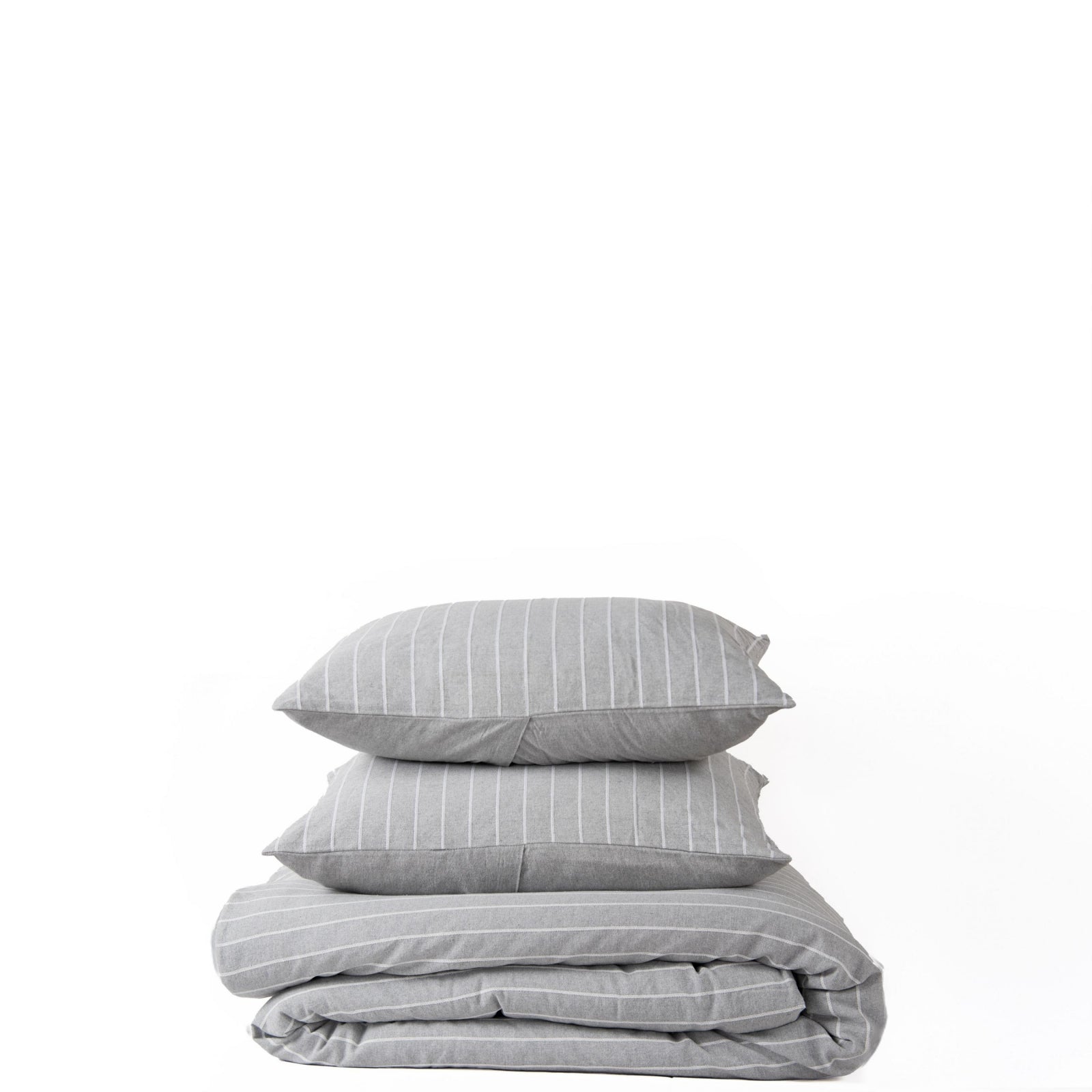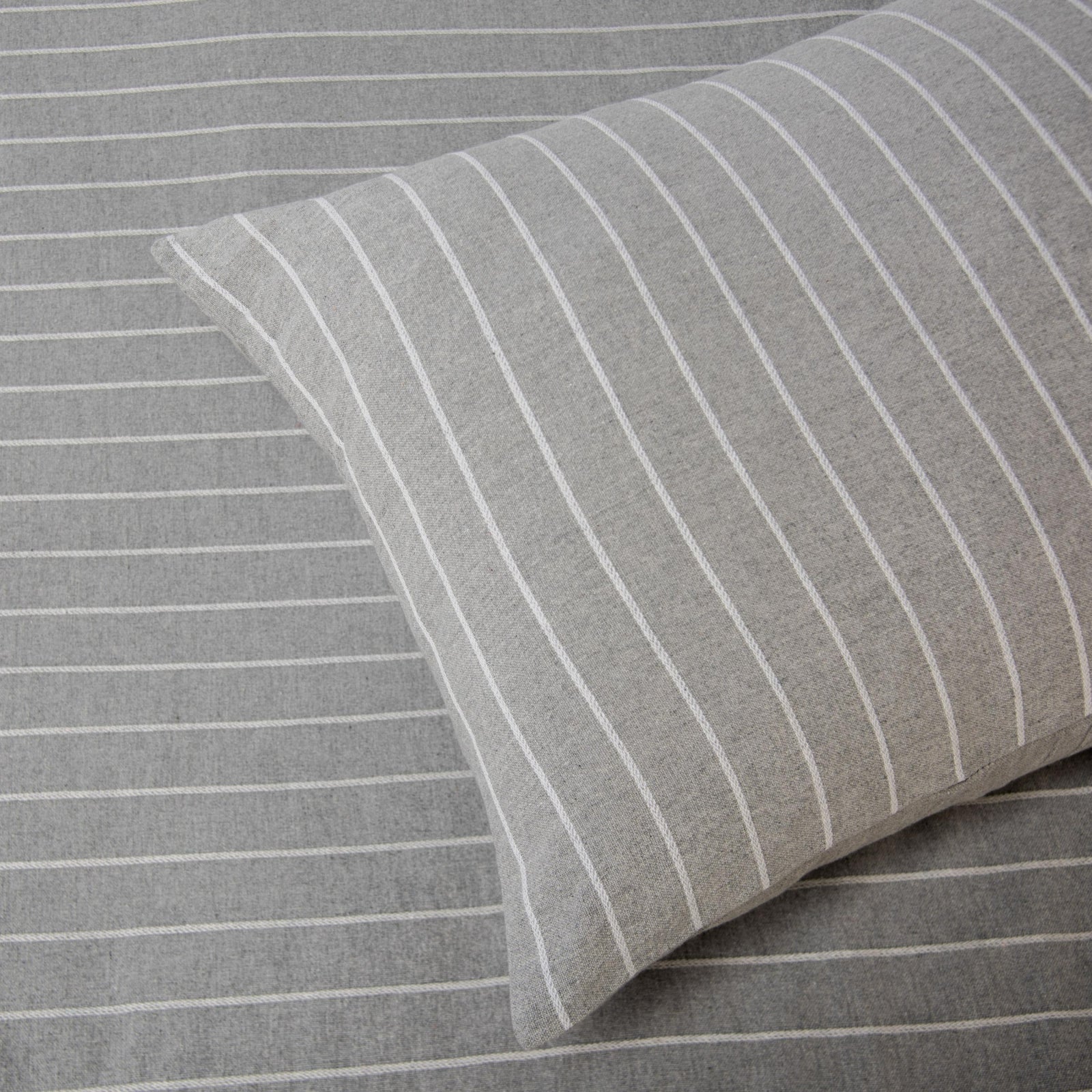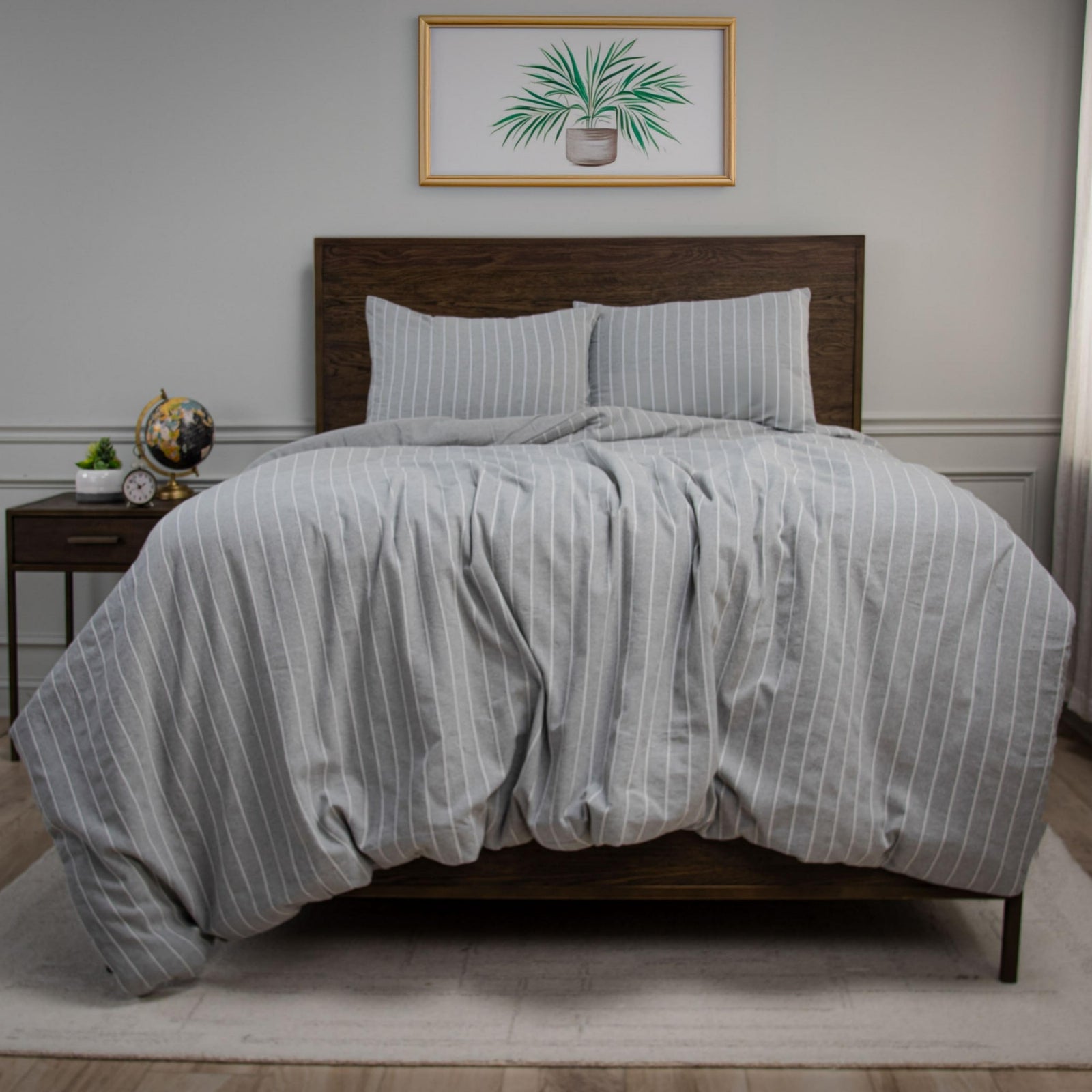 Transform your bedroom into a haven of tranquility with the Willow Lane Comforter Set by Rizzy Home. Crafted in a soothing, grey hue, this 106'' x 96'' king-size comforter effortlessly balances classic charm with modern farmhouse style. The striped pattern and cotton slub front offer the look of linen that brings a touch of understated luxury to any space. Made from eco-friendly, recycled cotton, this comforter is as kind to the planet as it is to your home. Designed with multi-seasonal weight, it keeps you cozy and comfortable year-round, while the stitch-through construction ensures that the soft batting remains perfectly in place. The set includes two shams, each with a convenient split back for easy fill, giving your bed a tailored, polished look. The knife-edge design adds a sleek touch, giving this comforter the appearance of a plush, filled duvet but with the simplicity of a comforter. Experience the perfect blend of sustainability and style with the Willow Lane Comforter Set, creating a serene escape for years to come.
