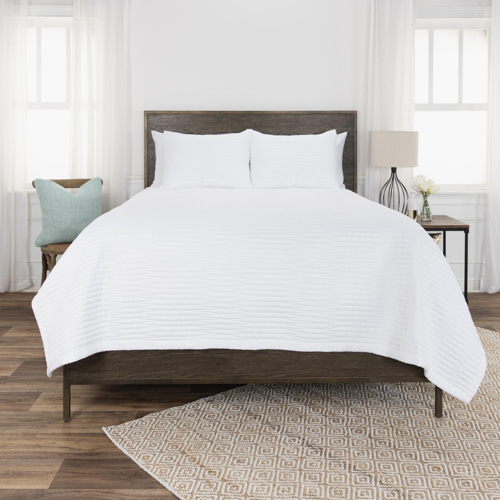 This crisp white three-piece bedding set from Rizzy Home's Parker Collection defines simple sophistication. Featuring a hand-quilted gentle wave design, this white modern meets industrial quilt adds texture and depth to minimalistic decor concepts, or can be used as a style anchor for layered accents, pillows or throws to create your own unique motif. This set includes two knife edged machine washable pillow shams with slit back enclosure for easy care and effortlessly chic style.