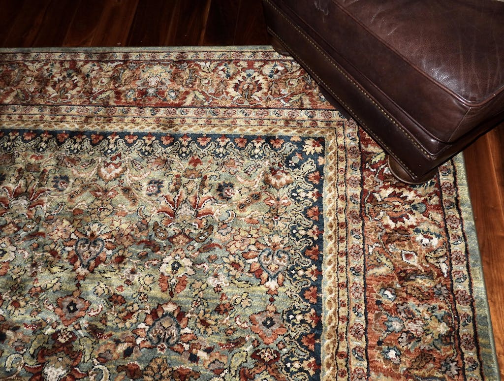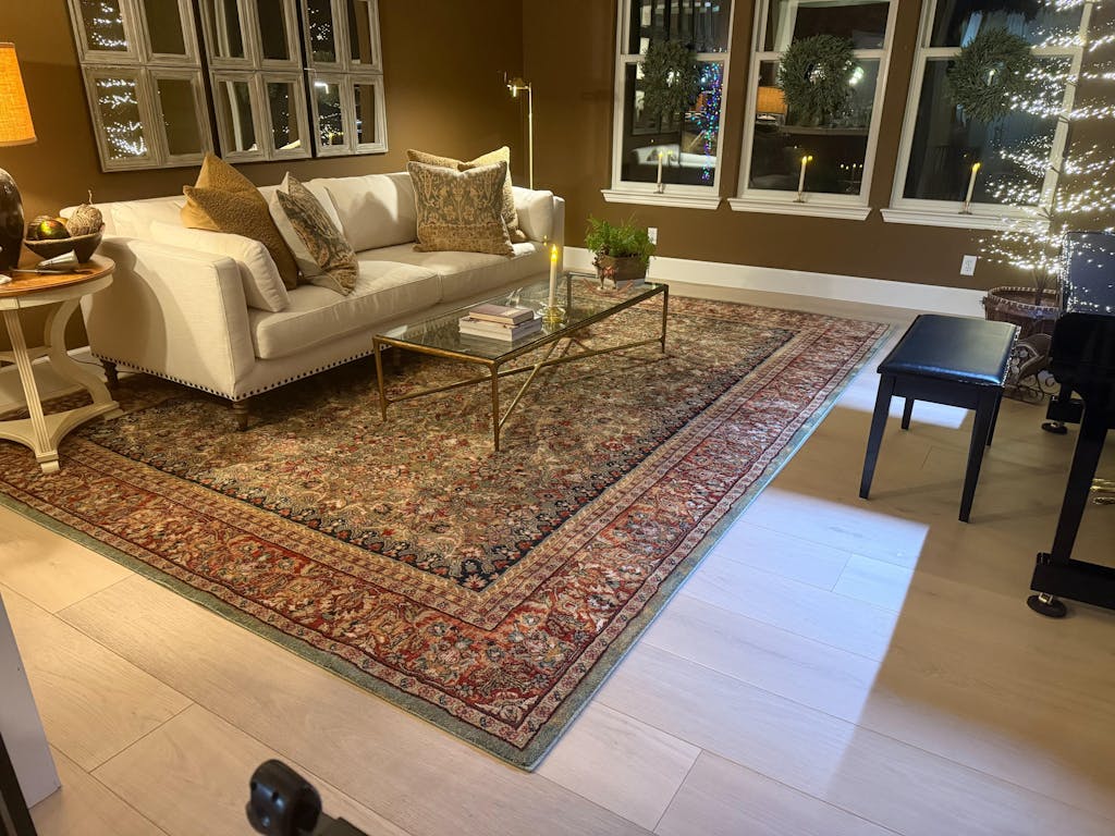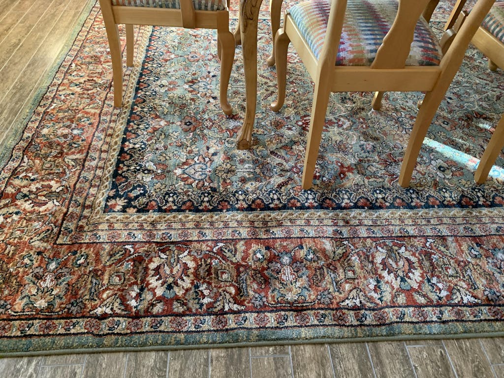 I bought the Karastan Spice Market Tigris Aquamarine 9’6”x12’11”. Please everyone when you write a review please include the specific rug name and color way you’ve bought, super helpful. Anyhow, I was worried aquamarine would be too light or more for a childs room, like I envision aquamarine. This rug is lovely. Darker rich moody coloring. Nice coloring contrasts. Beautiful design too. I did have to put books down along one entire edge to flatten, worked perfectly. There was a buckle at the opposite end and I worried it would not lay flat because as I stood on the buckle it just moved to one side or the other. We decided to but a bunch of books on that area too and it helped greatly. Now just one or two spots I’ll put books on and we should be good to go. I’ve had this rug for about 4 days now. The first 4 pics are at night and last two are during the day so you can see in different lighting. Highly recommend. I’m now shopping on this site for more, but different of course. I’m not one that likes the same rug more than once, but complementary. I do want to mention, I really appreciate the free shipping but the shipping company may still be going through a transition of a purchase. Their website said it was at the transfer station since the 8th, but they didn’t have it and said it was in southern ca, no record it went to So California, anyhow, back n forth trying to locate my rug, they said to call on the 12th to schedule a delivery thinking it would be in Northern CA by then. Next thing I knew, a local guy on the 12th called saying he can be at my house in 10 minutes. No appt made. I was thrilled to get it, just a note, they don’t communicate well obviously. No idea what would have happened if I wasn’t home. Delivery guy was so kind, helped me bring into my hallway. I don’t think you could go wrong with this beautiful rug if if compliments your aesthetic.