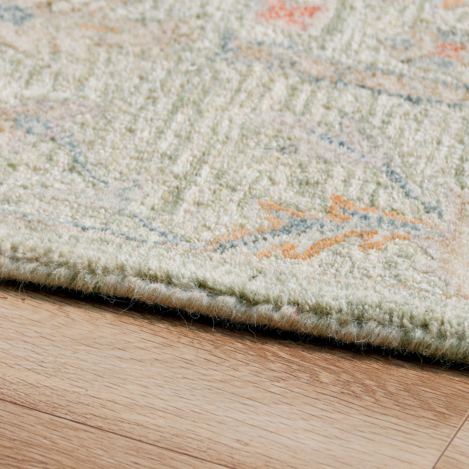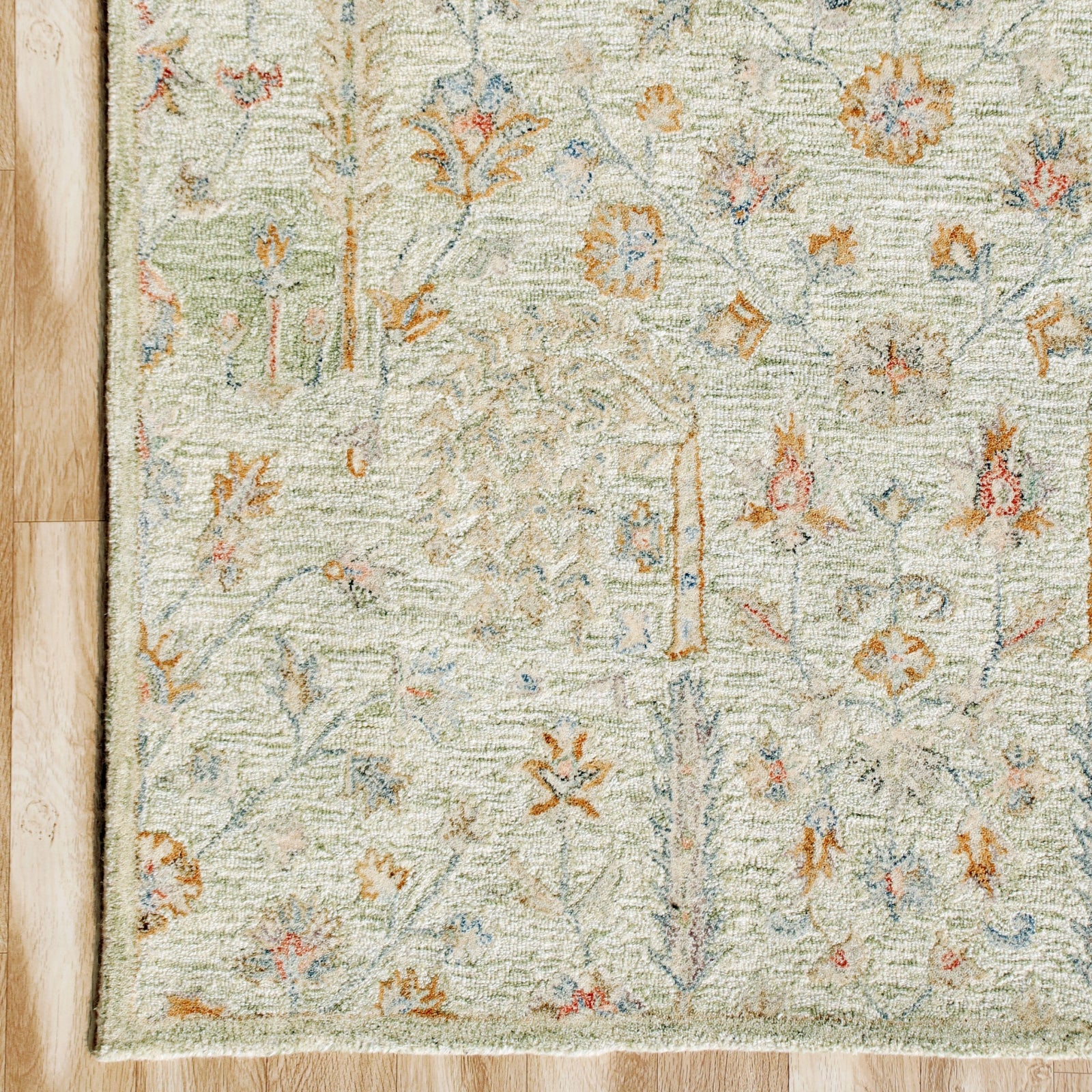 Elements of abstract garden motifs and distressed floral design meld together to create this timeless traditional area rug. This wool rug features a modest array of neutral colors in shades of light green, cream, and taupe with hints of blue, red, and orange. Made for the home with high-traffic spaces, this hand tufted area rug highlights the extravagant look and feel of a vintage wool rug plus with a durable lifespan and affordable price point.
