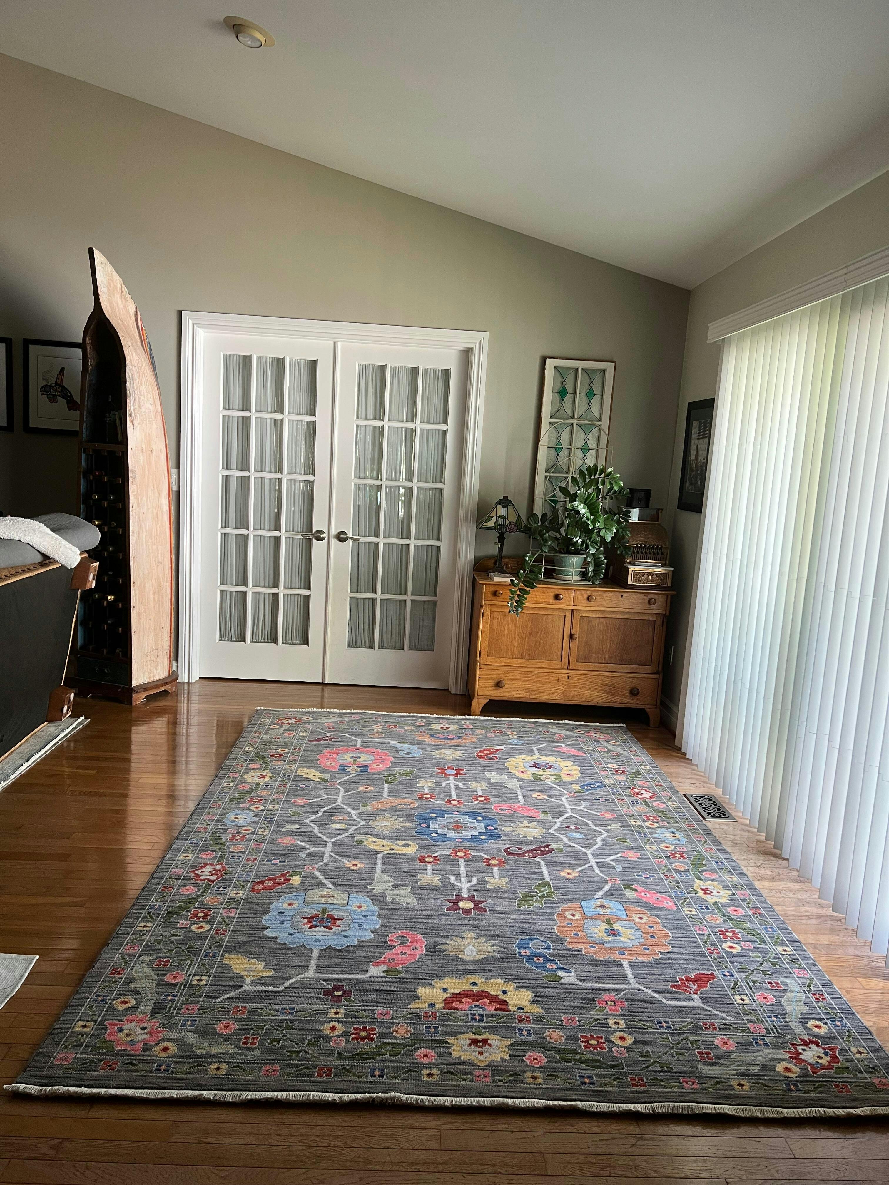 Nice to have the gray background with the fun vibrant colors for my area rug-I have 2 Aussies-perfect to not show their foot travels…