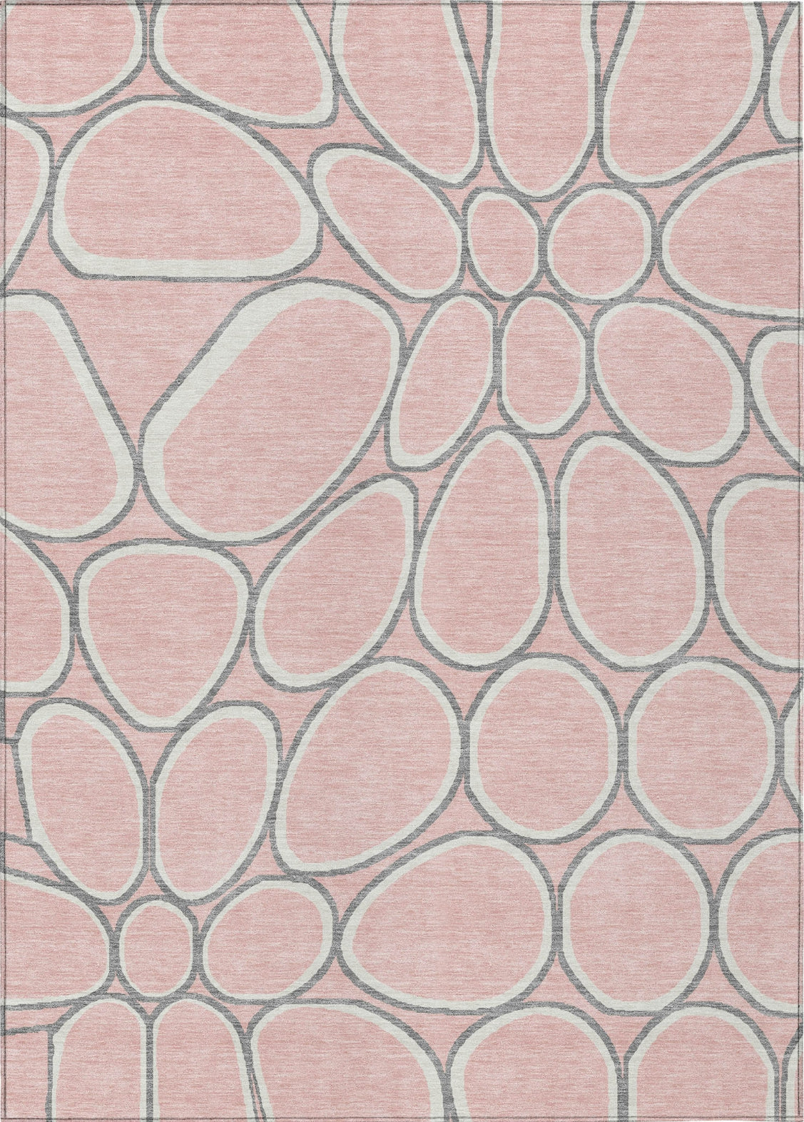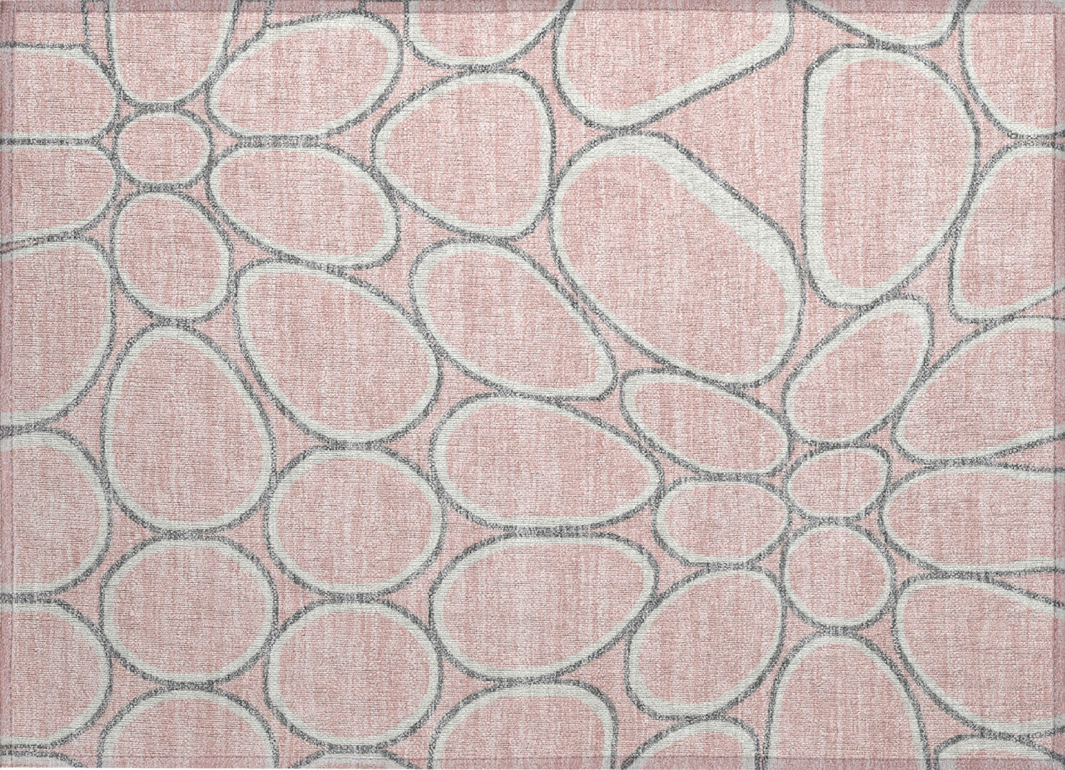 Our area rug's design features stone-shaped circles that touch, forming an engaging path pattern in a transitional style with a focus on circular forms. It's a versatile addition to any space, UV stabilized to prevent fading, ultra-thin for easy placement, machine-washable for effortless care, and durable enough to be family and pet friendly.