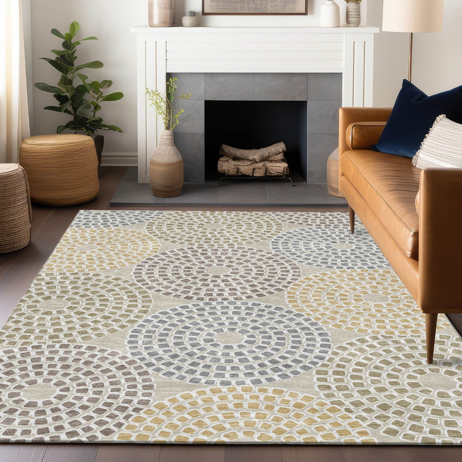 Embrace a blend of art and functionality with our area rug, showcasing mosaic tile circles in a transitional style. This rug is UV stabilized for both indoor and outdoor use, ultra-thin for easy placement, and machine-washable, making it an ideal addition to homes with kids and pets.
