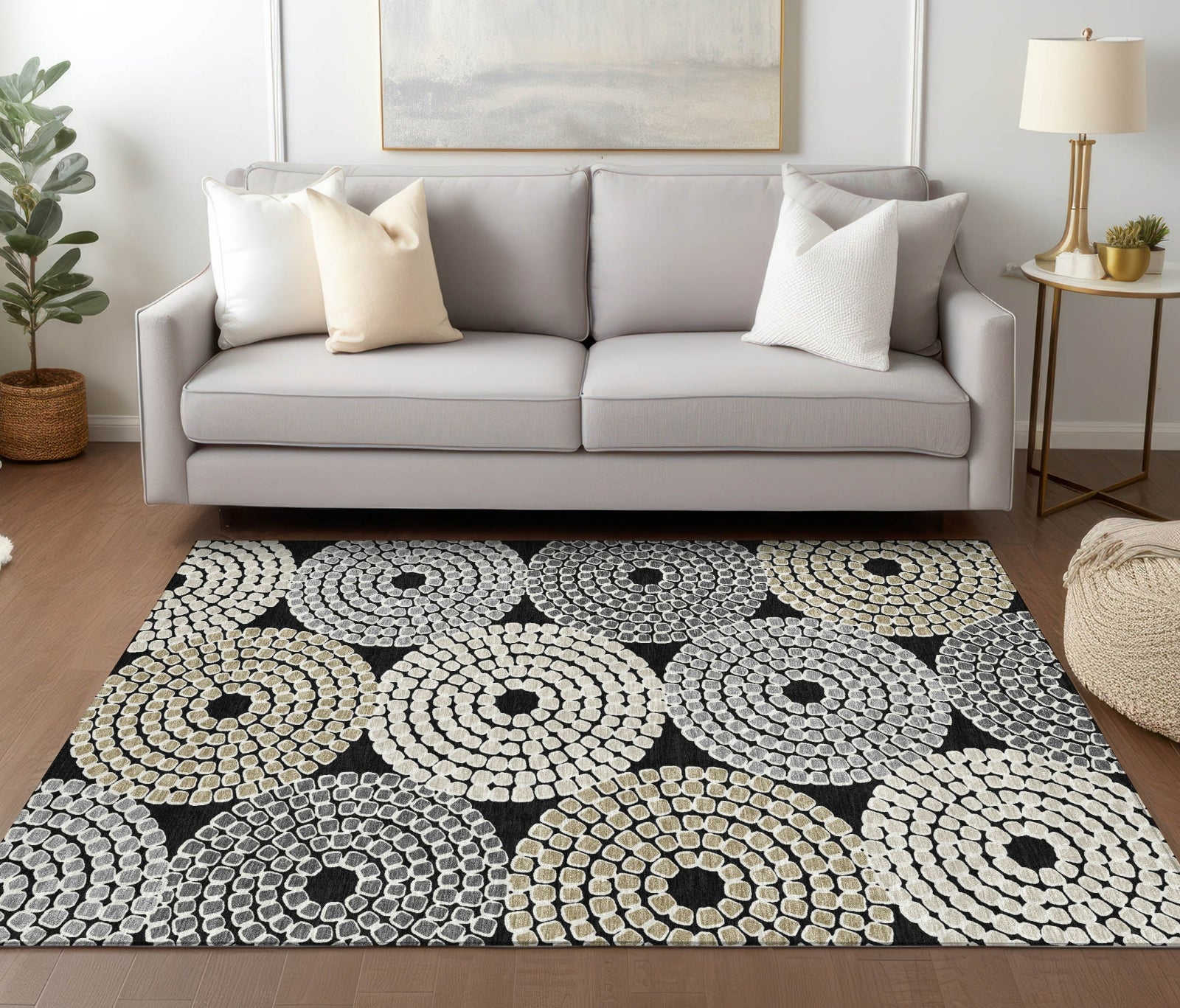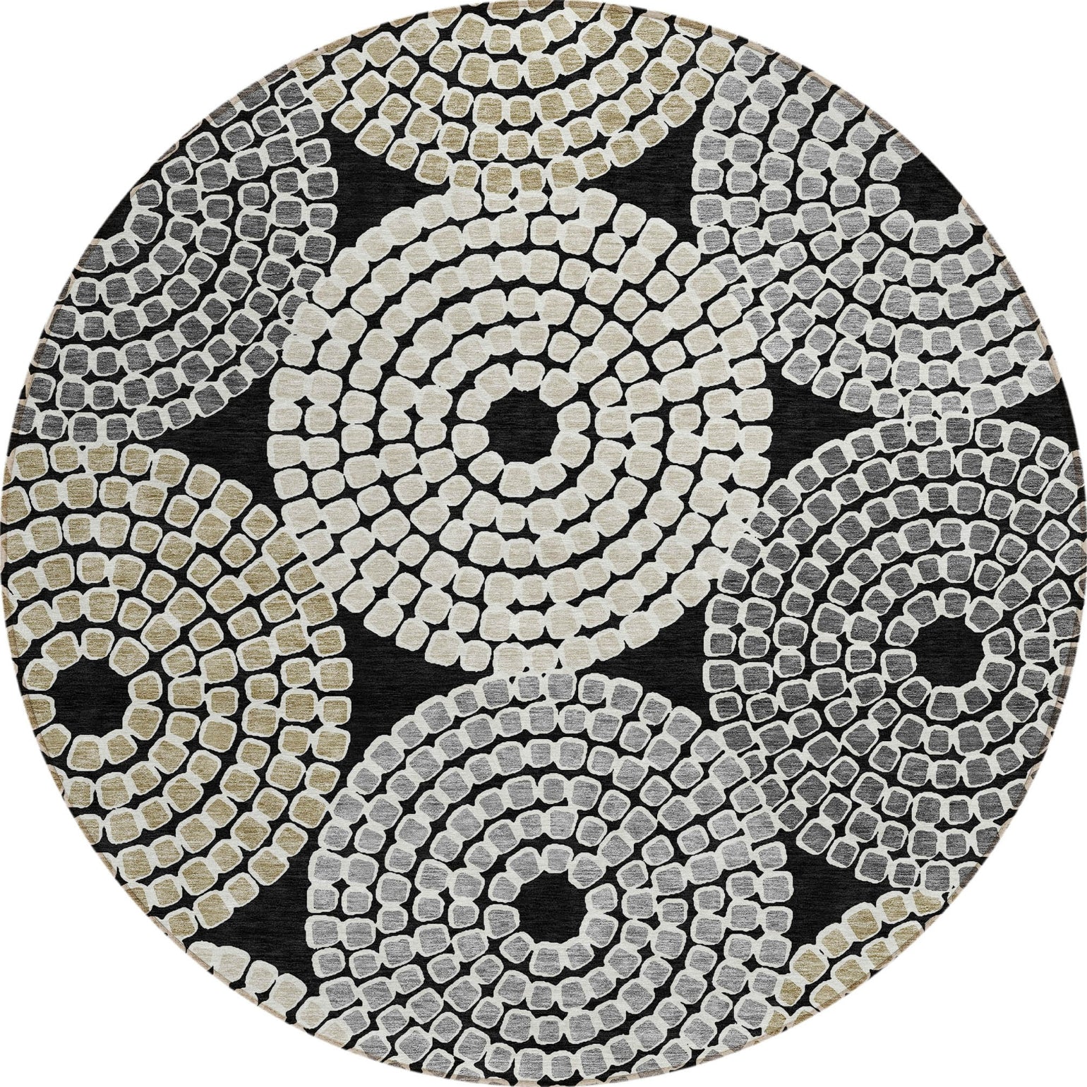 Embrace a blend of art and functionality with our area rug, showcasing mosaic tile circles in a transitional style. This rug is UV stabilized for both indoor and outdoor use, ultra-thin for easy placement, and machine-washable, making it an ideal addition to homes with kids and pets.