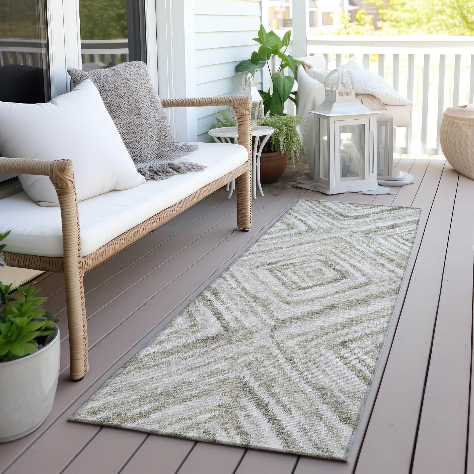 This rug, with its repetitive diamond pattern formed by intricate small lines, strikes a perfect balance between transitional and contemporary styles. The diamond design adds a rhythmic and upscale feel to any area. Additionally, it is UV stabilized for flexible use, ultra-thin for a sleek appearance, machine-washable for easy upkeep, and welcoming for families with pets.