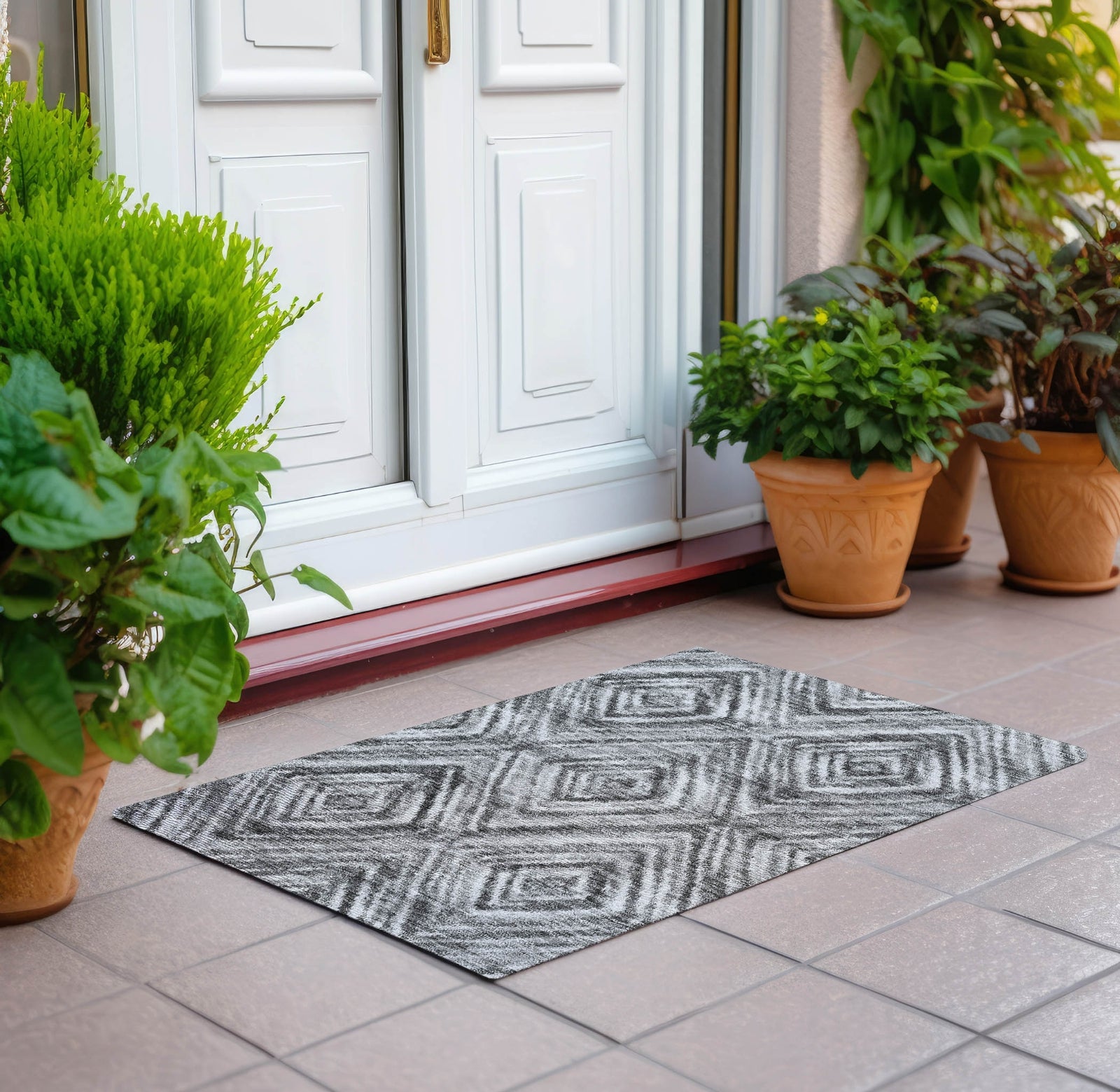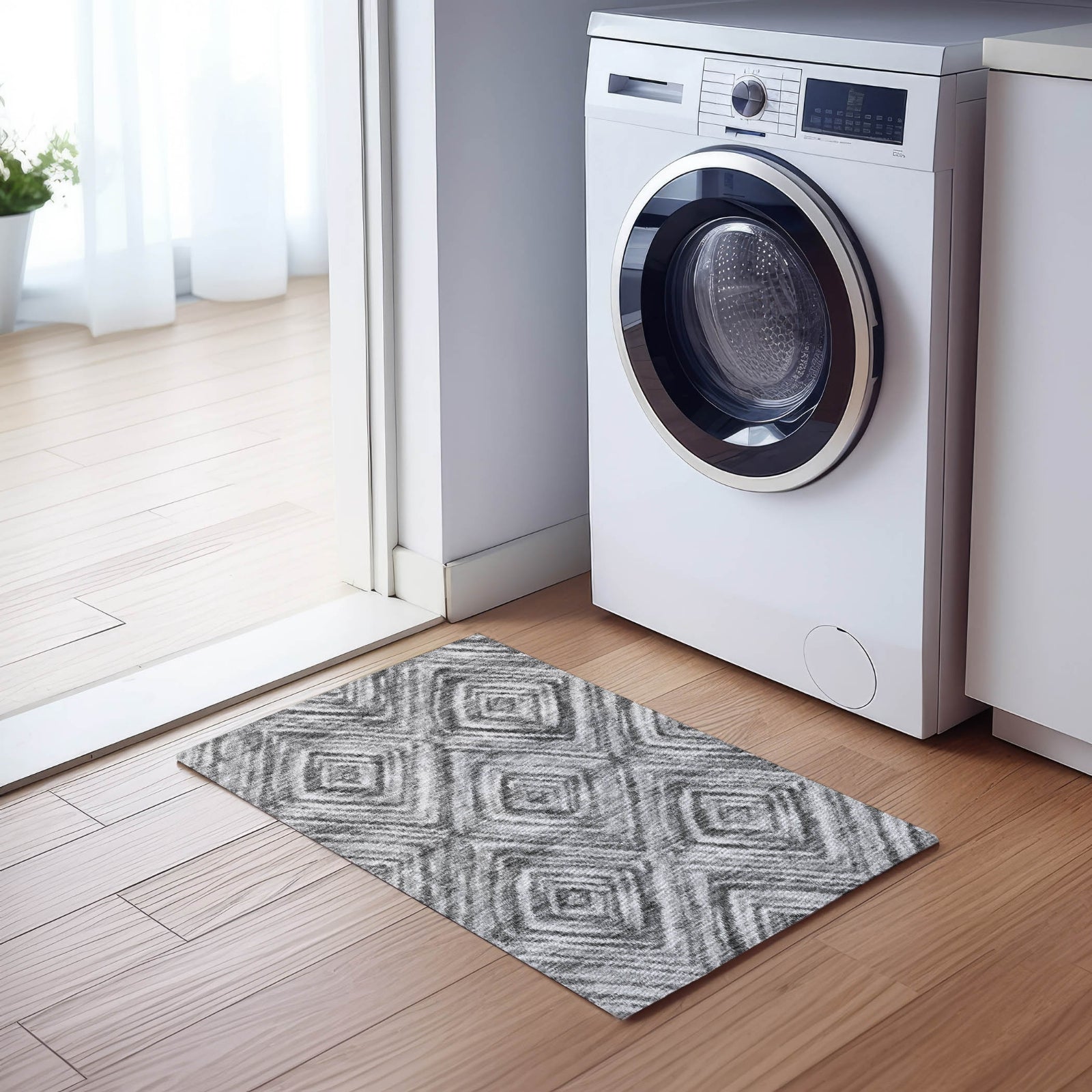 This rug, with its repetitive diamond pattern formed by intricate small lines, strikes a perfect balance between transitional and contemporary styles. The diamond design adds a rhythmic and upscale feel to any area. Additionally, it is UV stabilized for flexible use, ultra-thin for a sleek appearance, machine-washable for easy upkeep, and welcoming for families with pets.