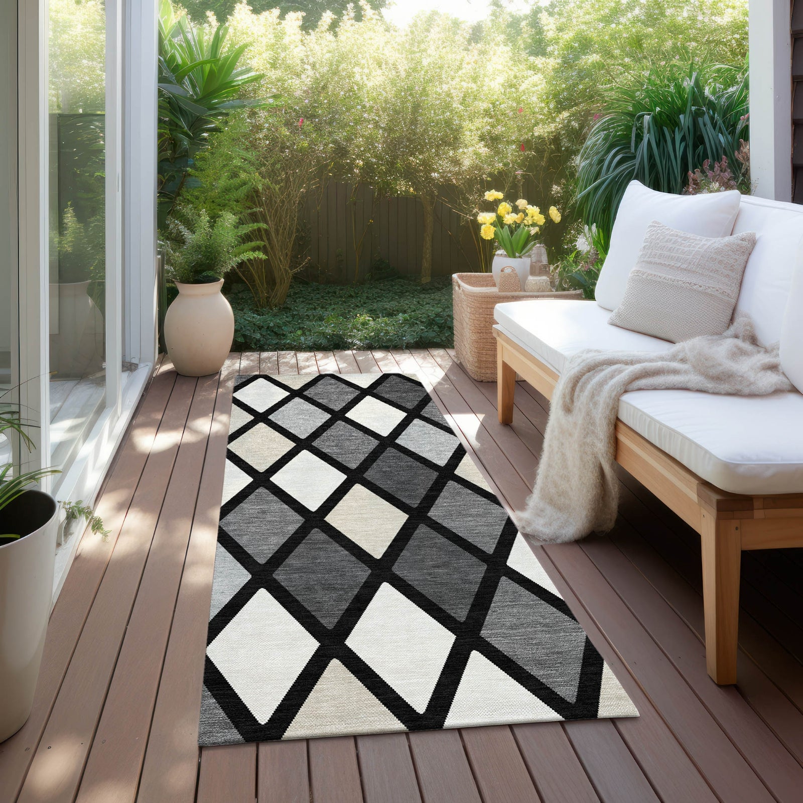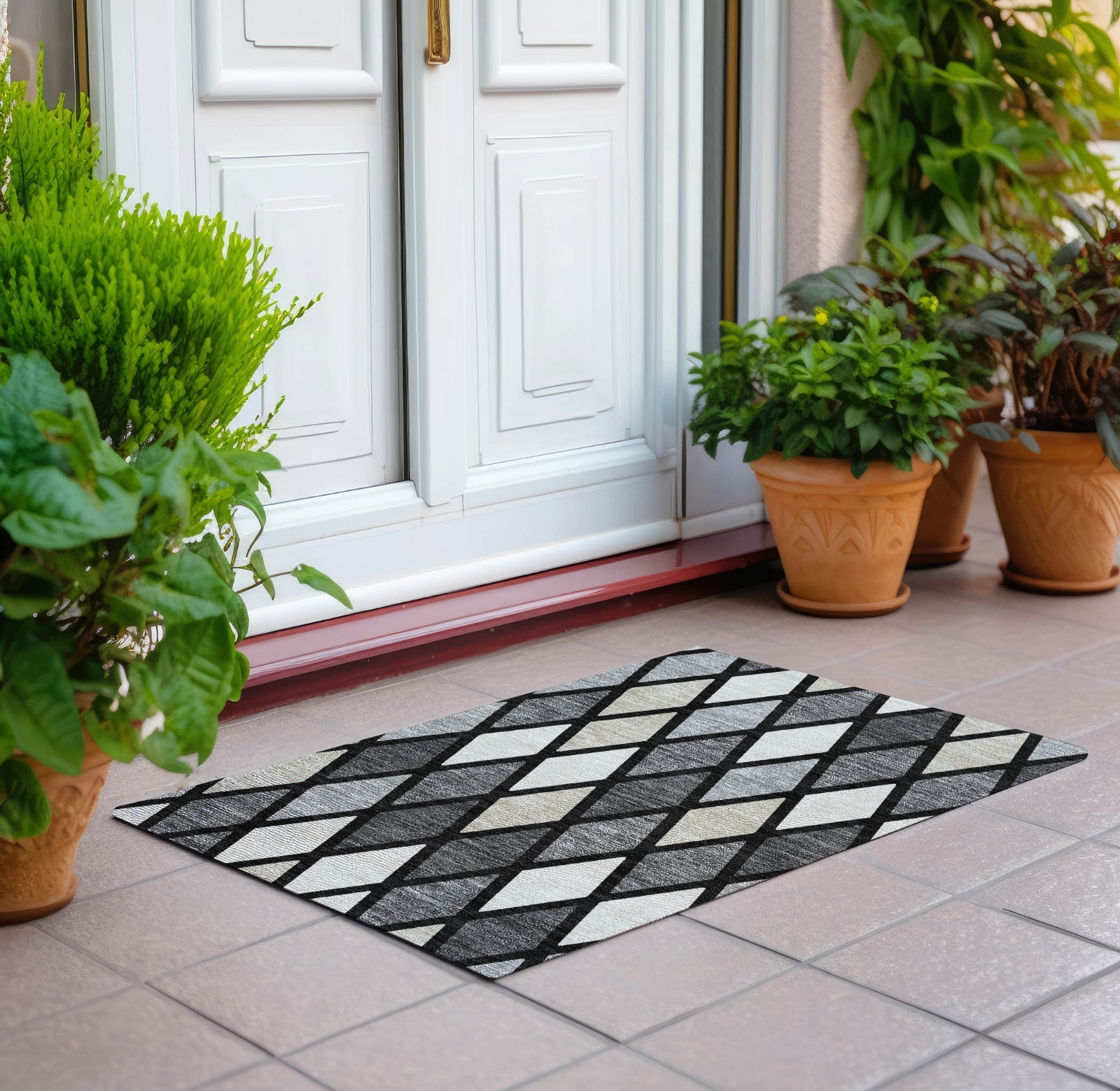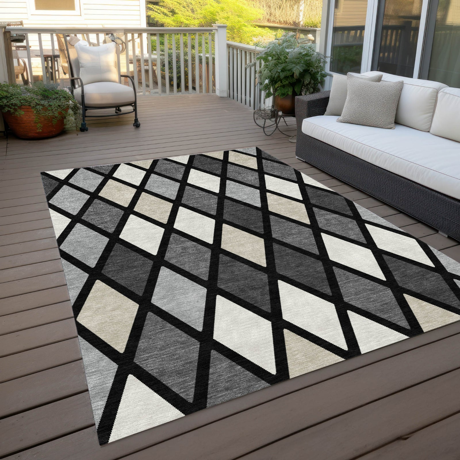 Revel in the beauty of our area rug, where small diamonds form a mesmerizing lattice pattern, harmoniously combining transitional flair with timeless diamond designs. This rug is UV stabilized, ensuring it thrives in any indoor or outdoor environment. Its ultra-thin build allows for effortless placement, and the fact that it's machine-washable makes it a practical choice for households with kids and pets.