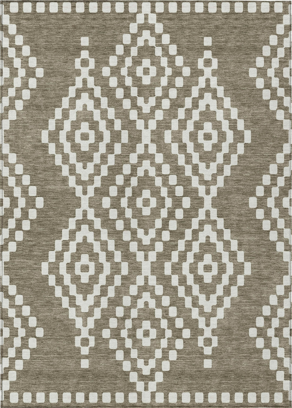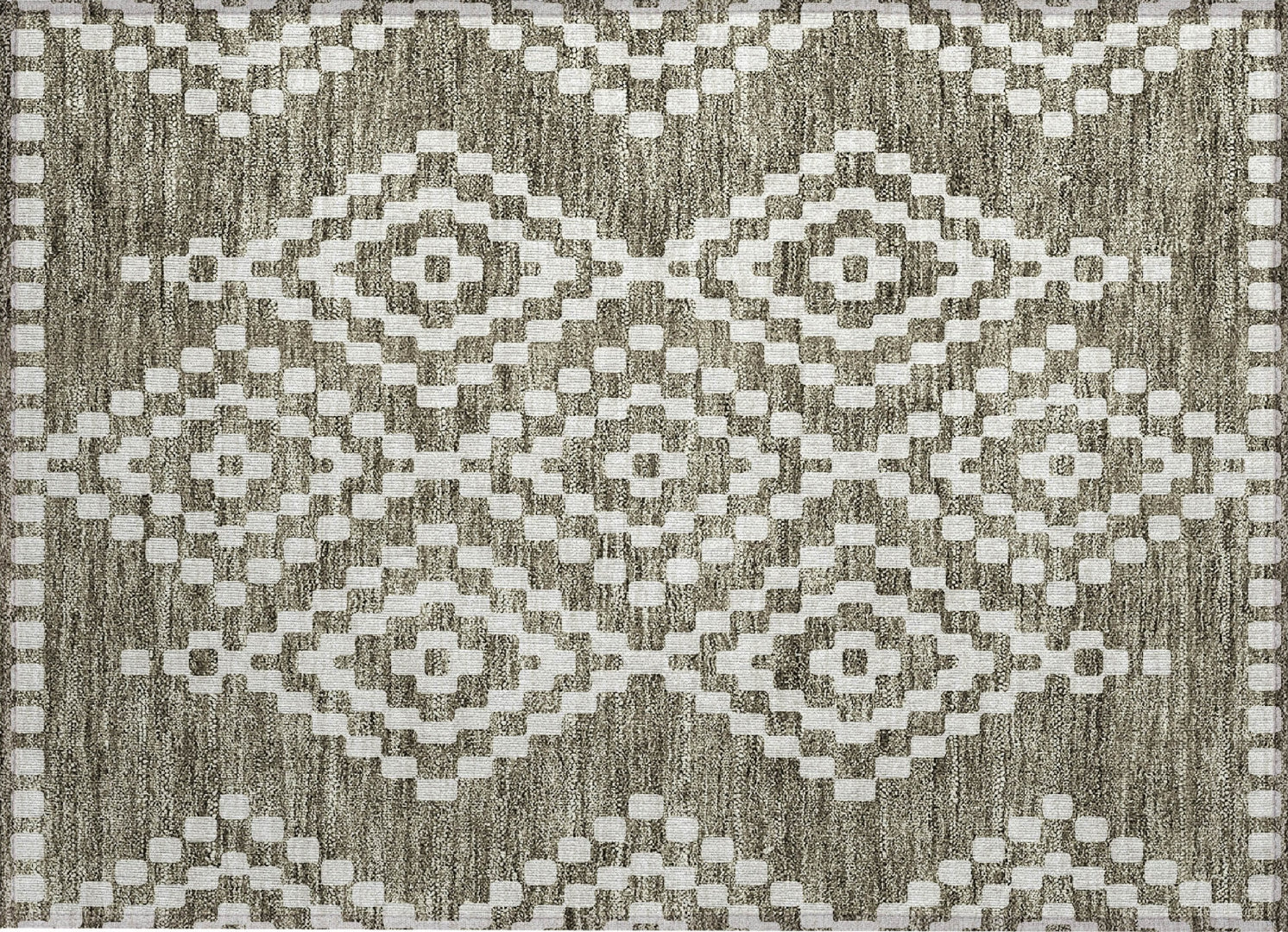 ''''Our area rug showcases a centered diamond pattern with a needlepoint-inspired feel, offering a blend of transitional style and timeless beauty. The diamond detailing adds a classic touch, and the rug's practical features make it an ideal choice: UV stabilized for any setting, ultra-thin for smooth integration, machine-washable for straightforward maintenance, and family- and pet-friendly.''''
