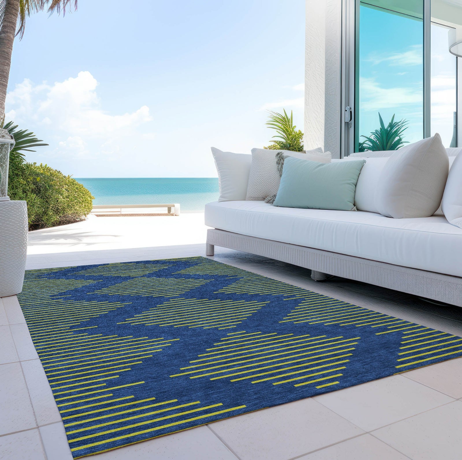 Adorn your floors with our stylish area rug, where a central diamond motif adds a touch of geometric sophistication. This transitional design is UV stabilized to thrive in both indoor and outdoor settings. With an ultra-thin construction and machine-washable fabric, its designed to offer ease and convenience in maintenance. As a family and pet-friendly rug, it stands up to the daily challenges of a lively home.