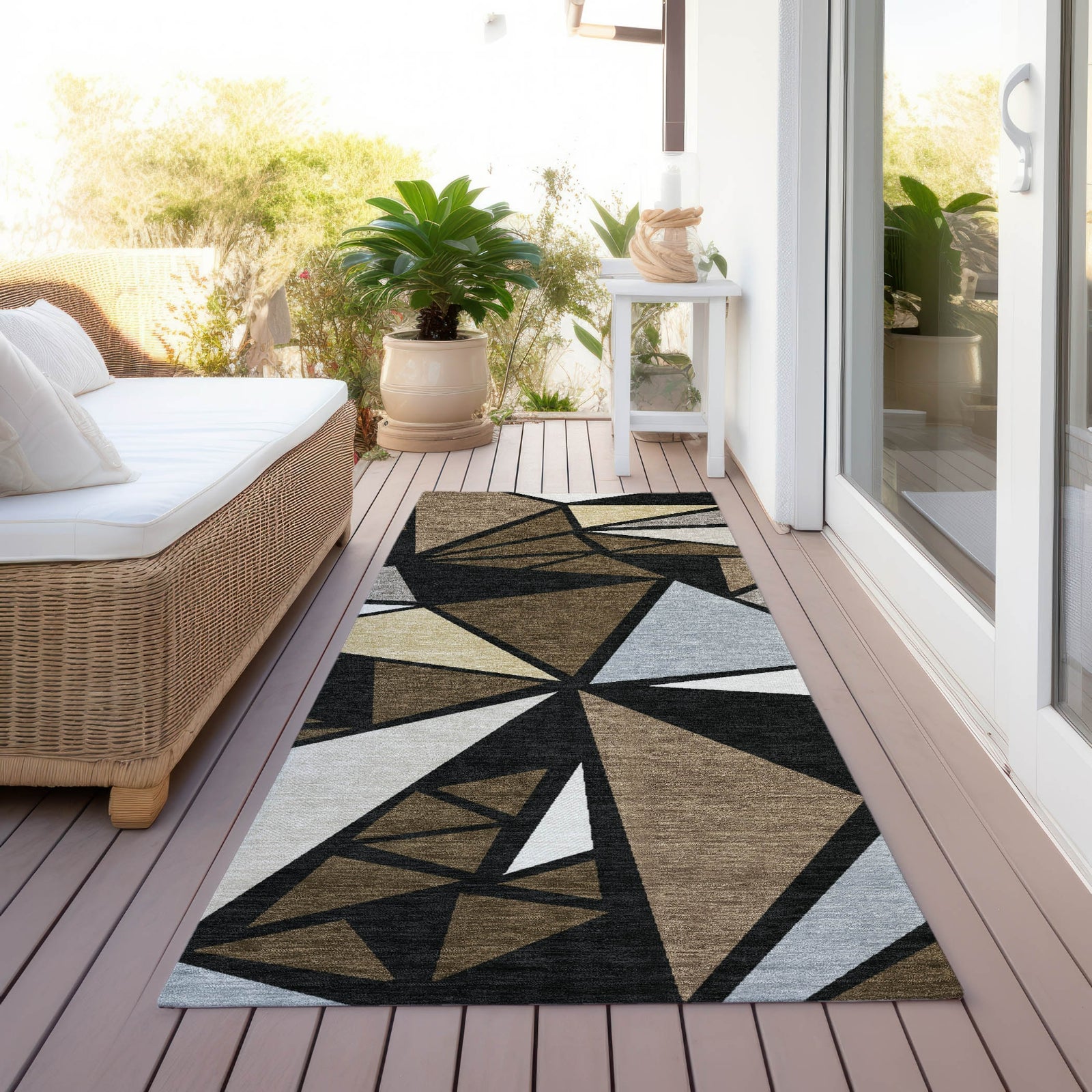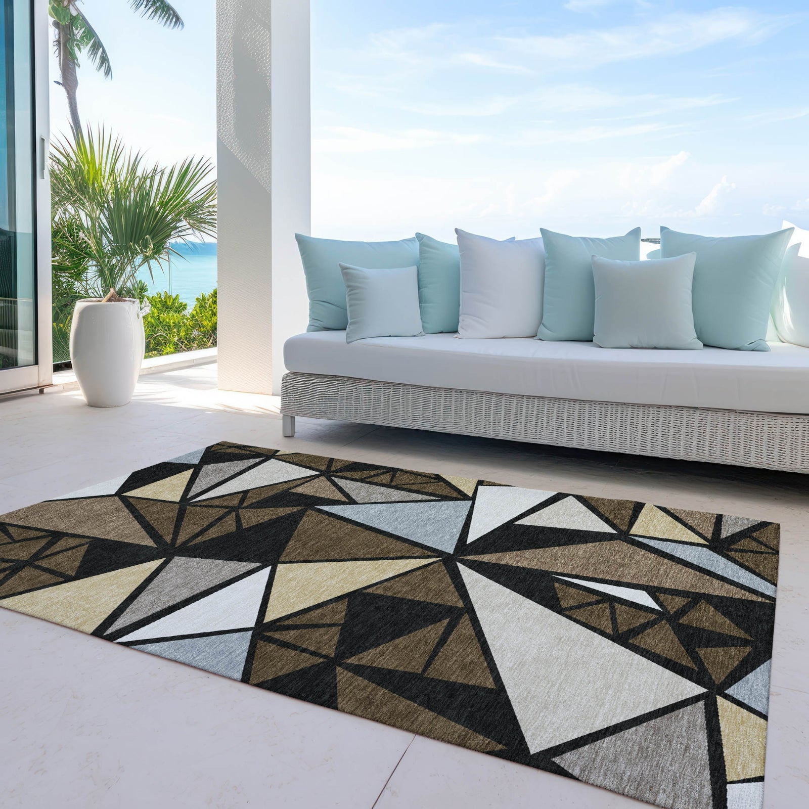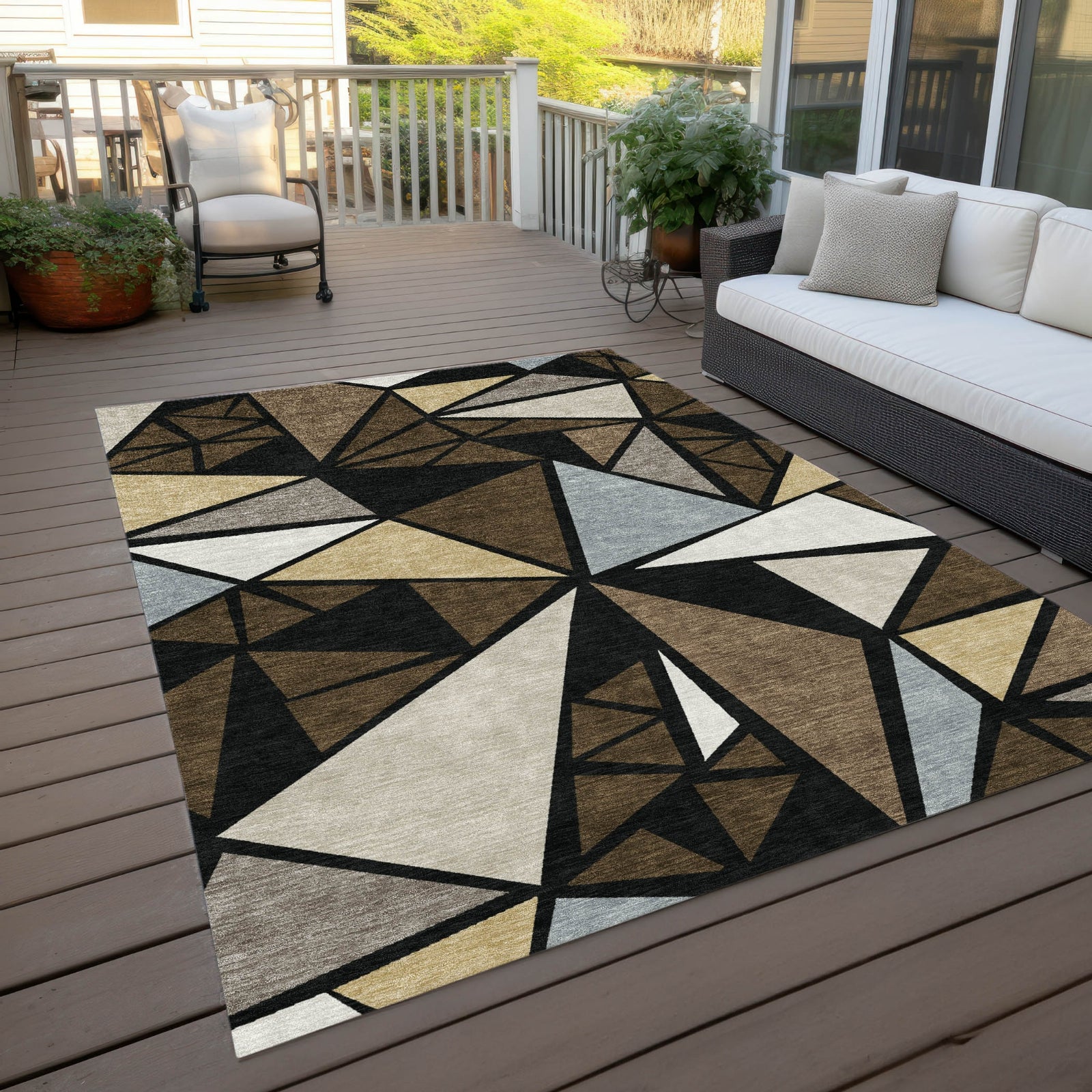 Transform your home with our area rug, which features a sophisticated geometric pattern with multi-shaped triangles, ideal for anyone looking to update their decor with a transitional touch. This rug is practical as well, with UV stabilization for indoor/outdoor use, an ultra-thin design for simplicity, machine-washable fabric for easy maintenance, and a family and pet-friendly build.