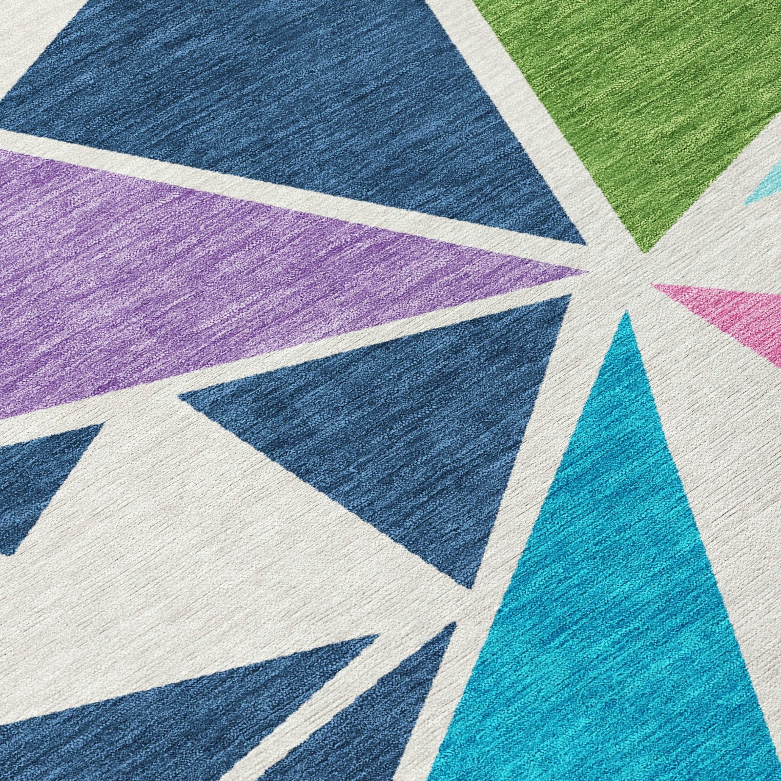 Transform your home with our area rug, which features a sophisticated geometric pattern with multi-shaped triangles, ideal for anyone looking to update their decor with a transitional touch. This rug is practical as well, with UV stabilization for indoor/outdoor use, an ultra-thin design for simplicity, machine-washable fabric for easy maintenance, and a family and pet-friendly build.