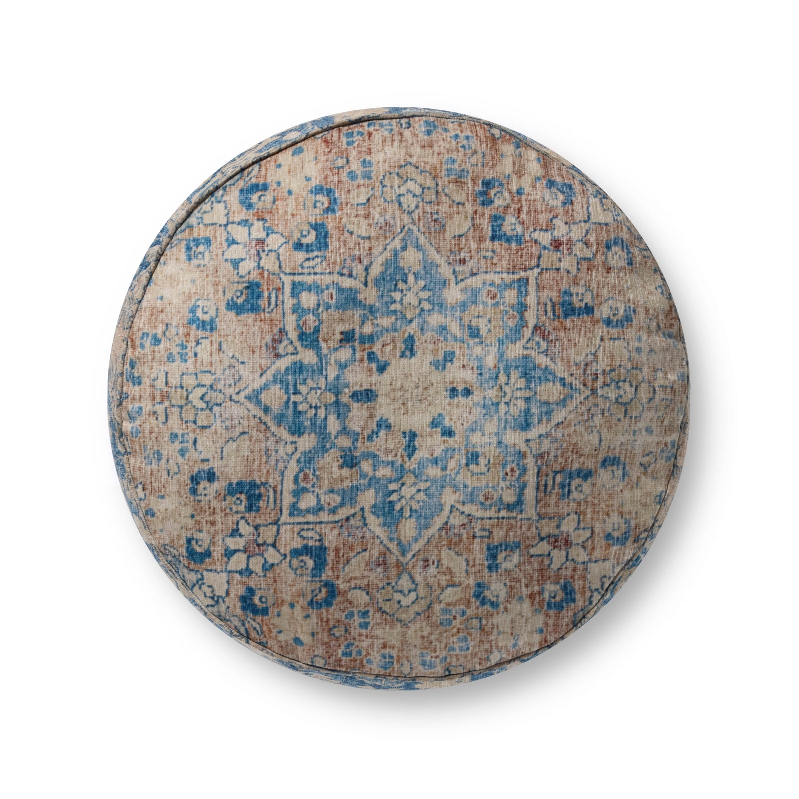 This blue-patterned pouf with a traditional design can be used as an accent, an ottoman, or extra seating in your living room or bedroom. The pouf measures 18''W x 18''D x 20''H and is machine-woven in China of easy-to-clean polyester.