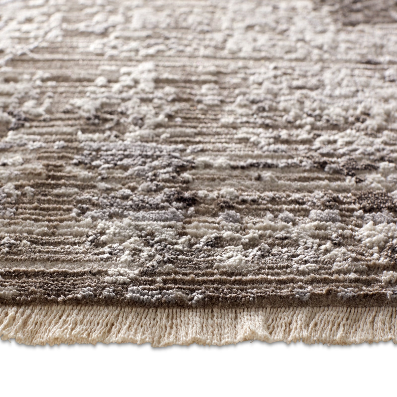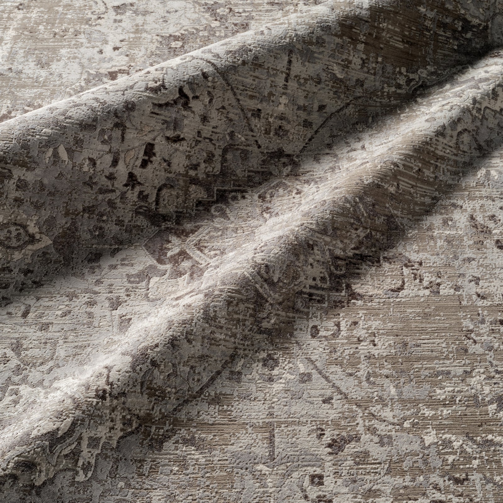 The stunning En Blanc collection captures the elegance of neutral, vintage-inspired patterns and melds Old World aesthetics with an updated and luxurious vibe. The Ginevra rug boasts a subtly distressed center medallion motif in tonal hues of silver, cool gray, golden tan, and light taupe. Soft and lustrous, this chameleon-like design emulates the timeless style of a Turkish hand-knotted rug, but in an accessible polyester and viscose power-loomed quality.