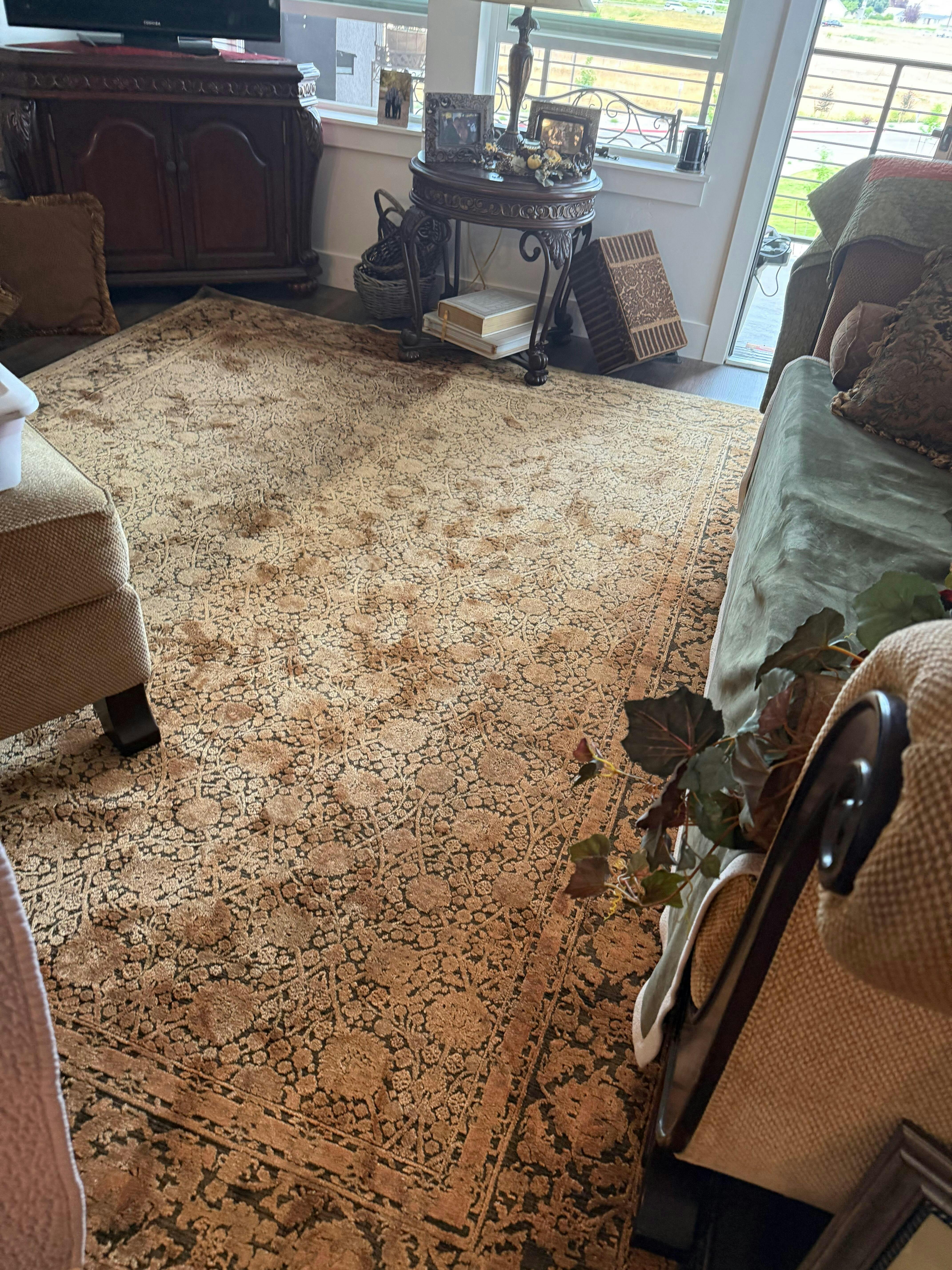 Care Instructions: Vacuum rugs regularly. Set the vacuum height gauge to its highest setting, as some powerful vacuums may damage the pile, bound edges or corners of your rug. Do not pull loose yarns, trim with scissors. It is normal for new rugs to shed fibers. Frequent vacuuming will aid in eliminating excess loose fibers. The shedding will diminish with regular wear and vacuuming. Blot spills immediately.