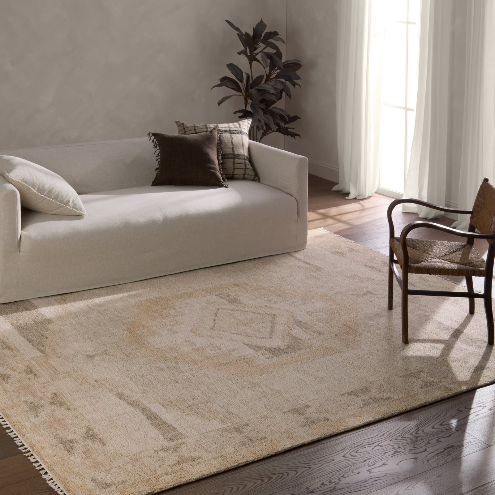 The Sevak collection skillfully emulates vintage designs with a simplified and tonal twist of modernity mixed into the motifs. These Kars-inspired patterns have the uncanny ability to ground a space with inviting and comfortable appeal while lending the perfect interest to a room. The heavily distressed Vashti design showcases an open, center medallion with a border and fringe to match. The tan and cream colorway establishes the global, vintage style. Naturally stain-resistant, the 100% wool pile is soft underfoot and easy to clean while maintaining effortless sophistication. Obtaining Nest Seal and RugMark certifications, this global area rug brings ethical, handmade luxury to the home.