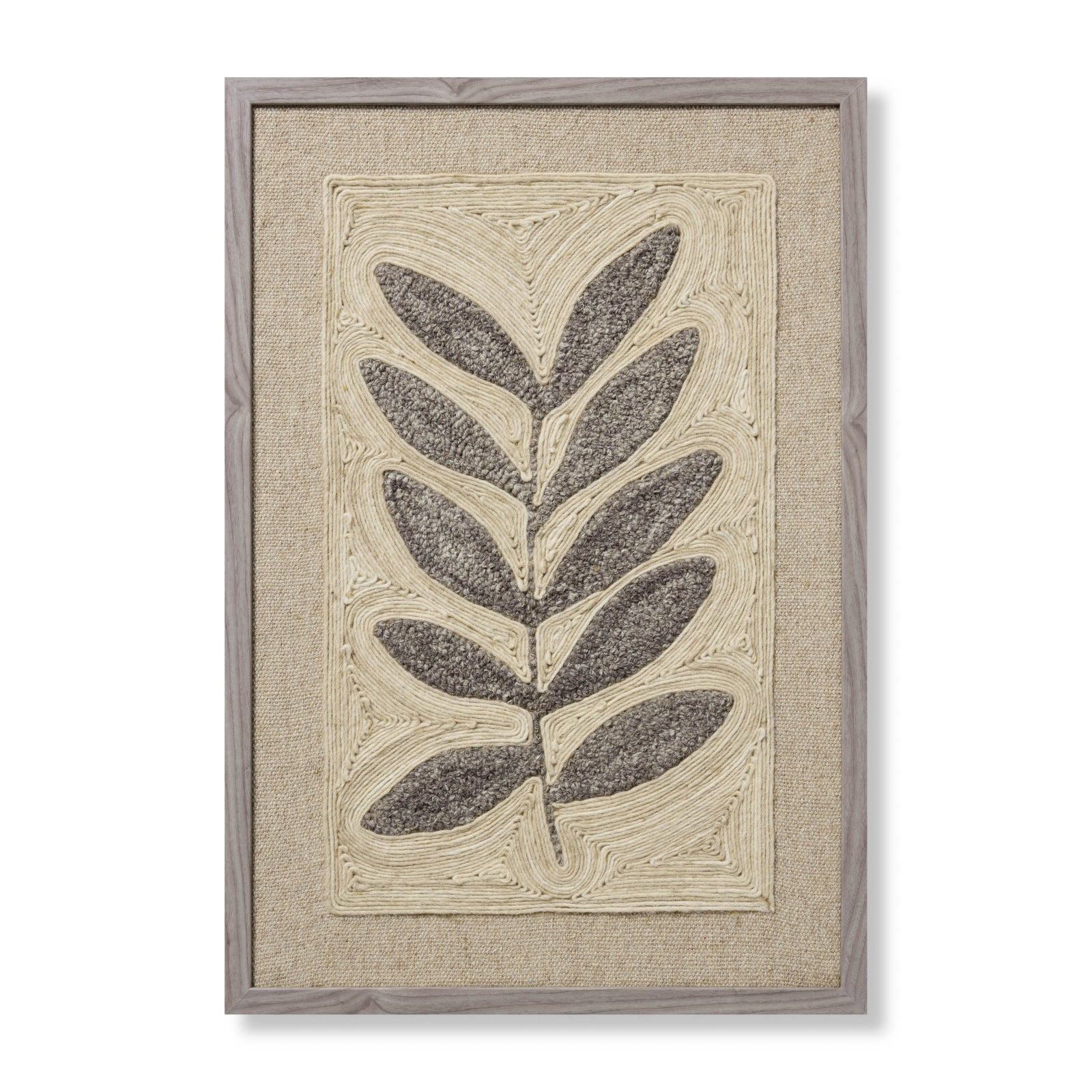 Frond & Fog is a handmade wall art piece with a grey-and-ivory botanical design, a wonderfully textural accent for bohemian or natural home decor. The artwork is crafted in India from wool and custom-framed by Loloi in the USA, measuring 26' x 38'.