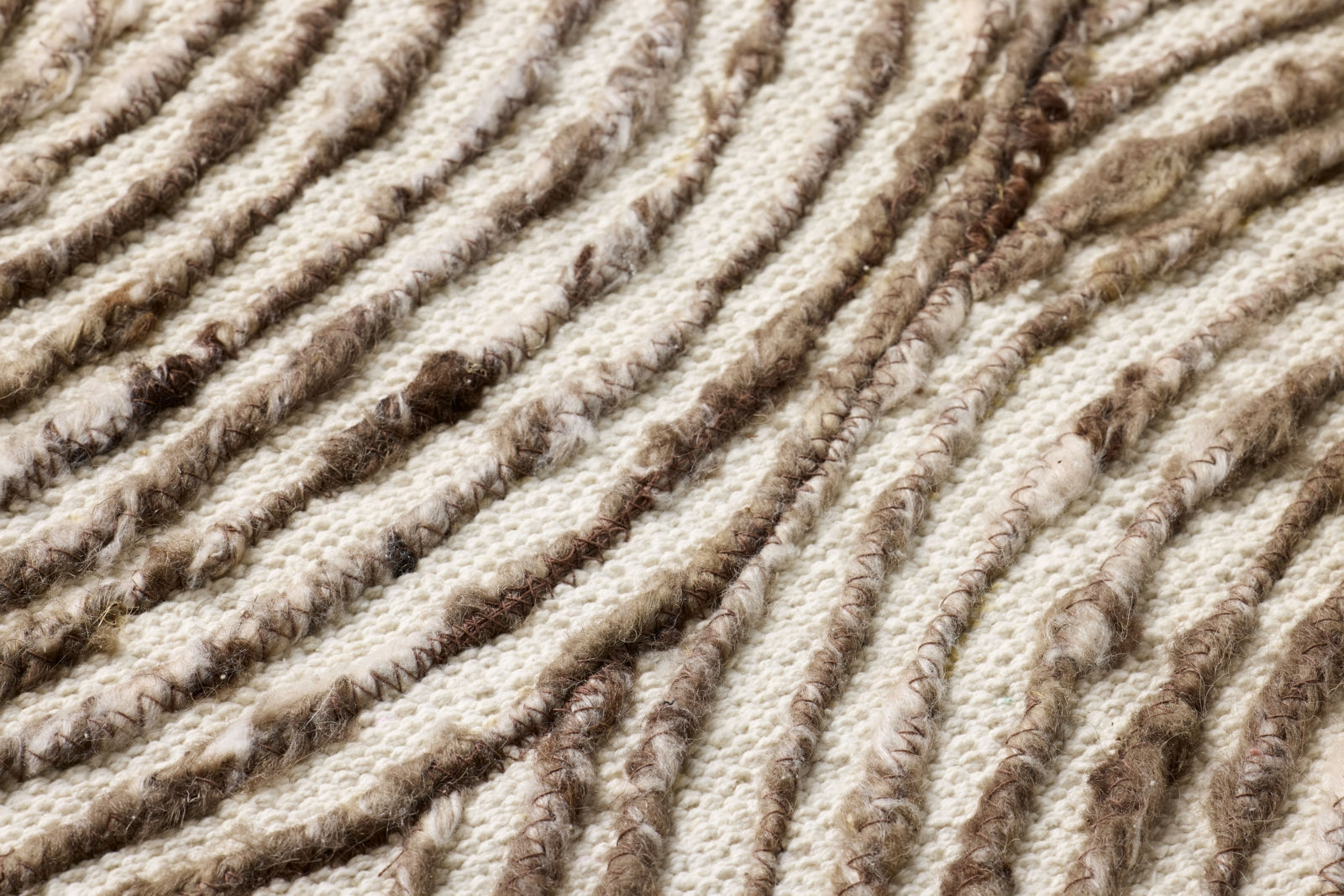 Phrase is hand-woven wall art with a brown-and-ivory curving abstract design, a neutral accent for bohemian or natural home decor. The artwork is crafted in India from wool, cotton, polyester, and other fibers, and custom-framed by Loloi in the USA, measuring 33' x 33'.