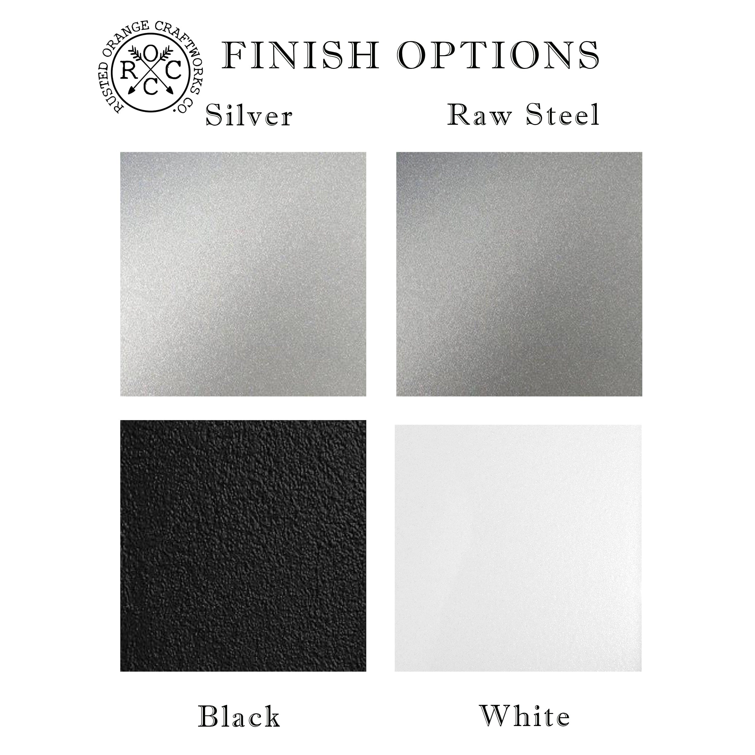 Finish Options: Choose from raw steel for a rustic look or powder coat in black, white, gold, or silver for long-lasting protection.
