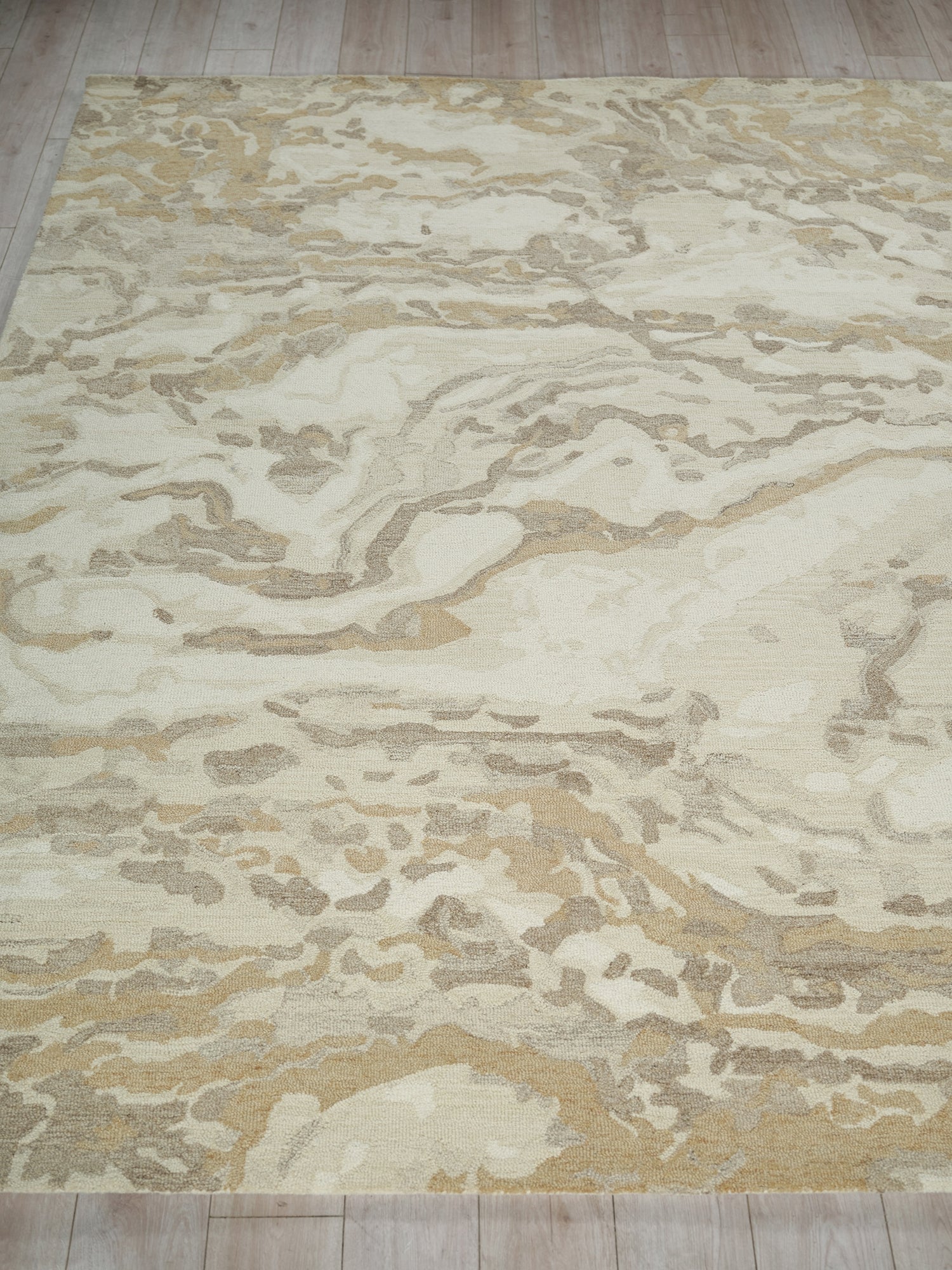 Hand Tufted of 100% wool this dense construction features overlapping design, creating the look of a marble-inspired design. The bands of color vary in thickness and intensity, adding a realistic touch to rug. Its soft edge, abstract design in muted washes of colors makes it a stunning addition to any interior space.