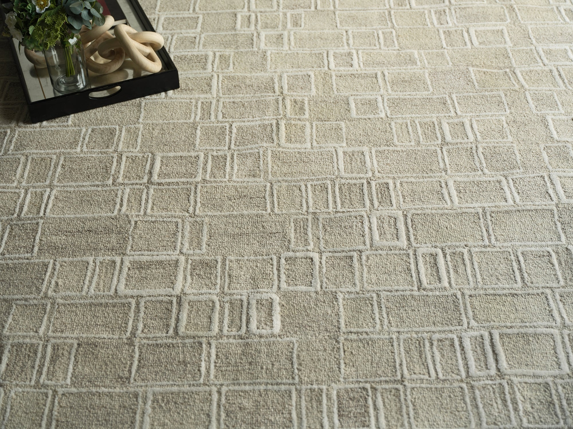 Textured, dense wool loop construction of random geometric shapes over a tweed background. Our hand tufted Soho Collection has just enough pattern to add a modern touch to your room.