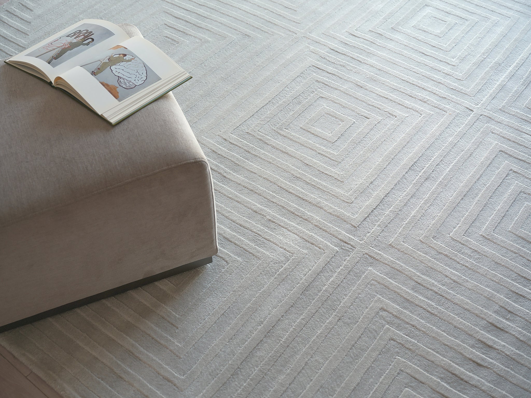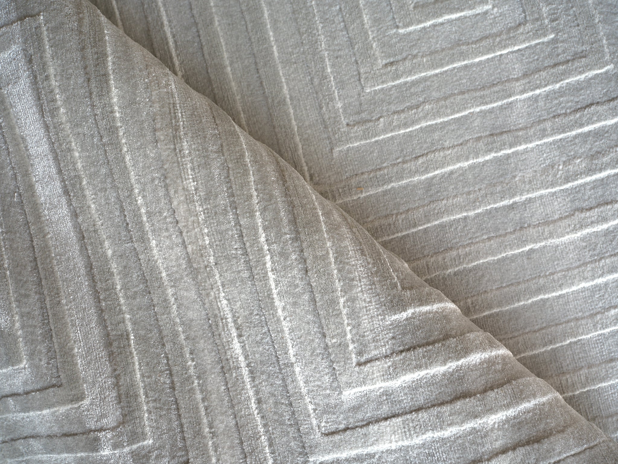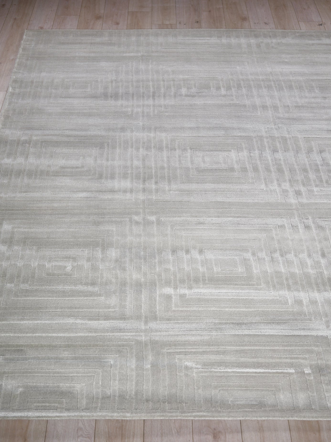 A velvet plush pile finish that has a silky sheen and luster of silk. Made with the performance of Nylon is truly unique. Overall, pattern is the classic repeating box design Ultra-Modern choice for anyone who wants a luxurious and durable rug that is easy to clean and maintain.