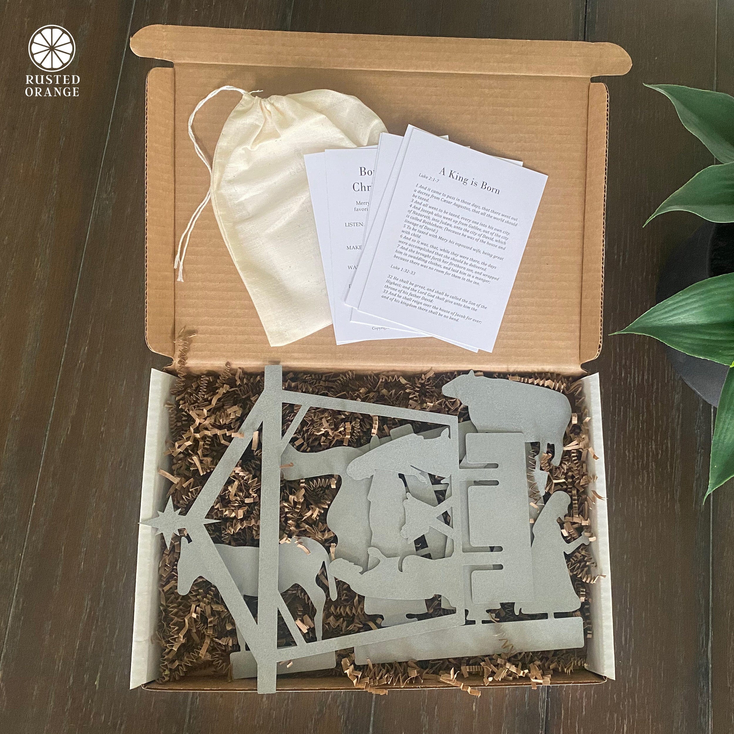 Embrace the serene spirit of Christmas with our unique nativity set, meticulously crafted from metal to bring an artistic touch to your holiday decor. This rustic manger serves as an eloquent reminder of the Birth of Jesus, blending tradition with a modern twist, perfect for those seeking to add a touch of uniqueness to their Christmas decorations. The set also includes cards with scriptures, questions to ponder, video links, and prompts to use during the holiday season, making it a great way to turn setting up this nativity scene into a cherished family tradition.