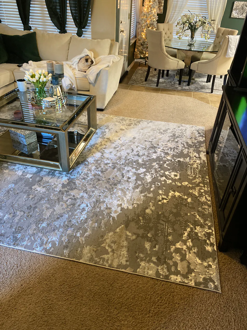 I first saw this rug on YouTube. Told myself I had to have. Bought 5x8 from Wayfair. Which was there largest. Wanted larger one for living room. After searching so excited to find. Ordered right away. Get compliments from everyone who ent were s my home. So beautiful love silver in rug. Looks different depending on what angle you look from. Rich quality. Worth the money!!!!