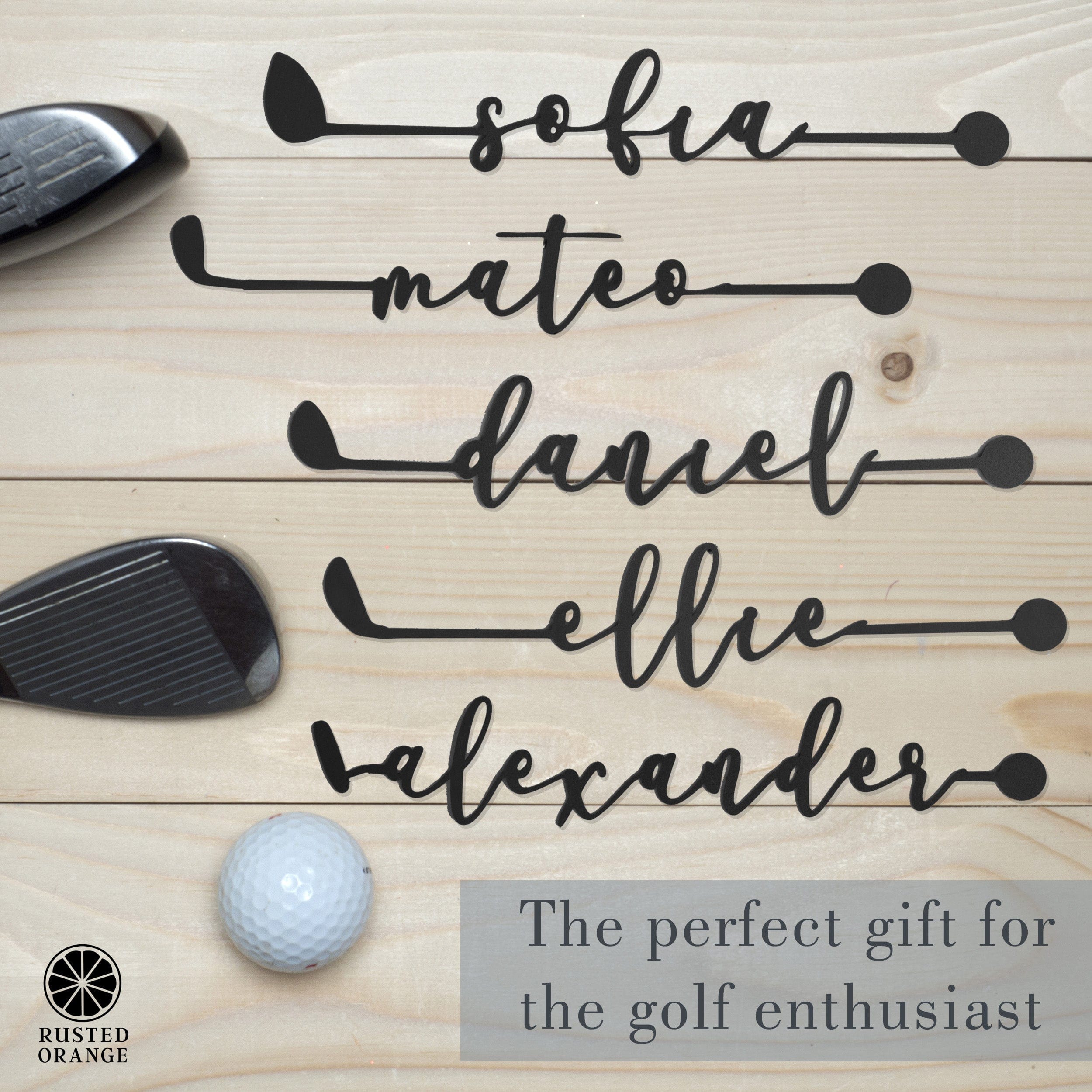 Unique golf metal wall art: This Father's Day gift features customizable metal cut golf clubs in a 3-pack set, adding a personalized touch to golf-themed decor and showcasing your family's love for the sport.