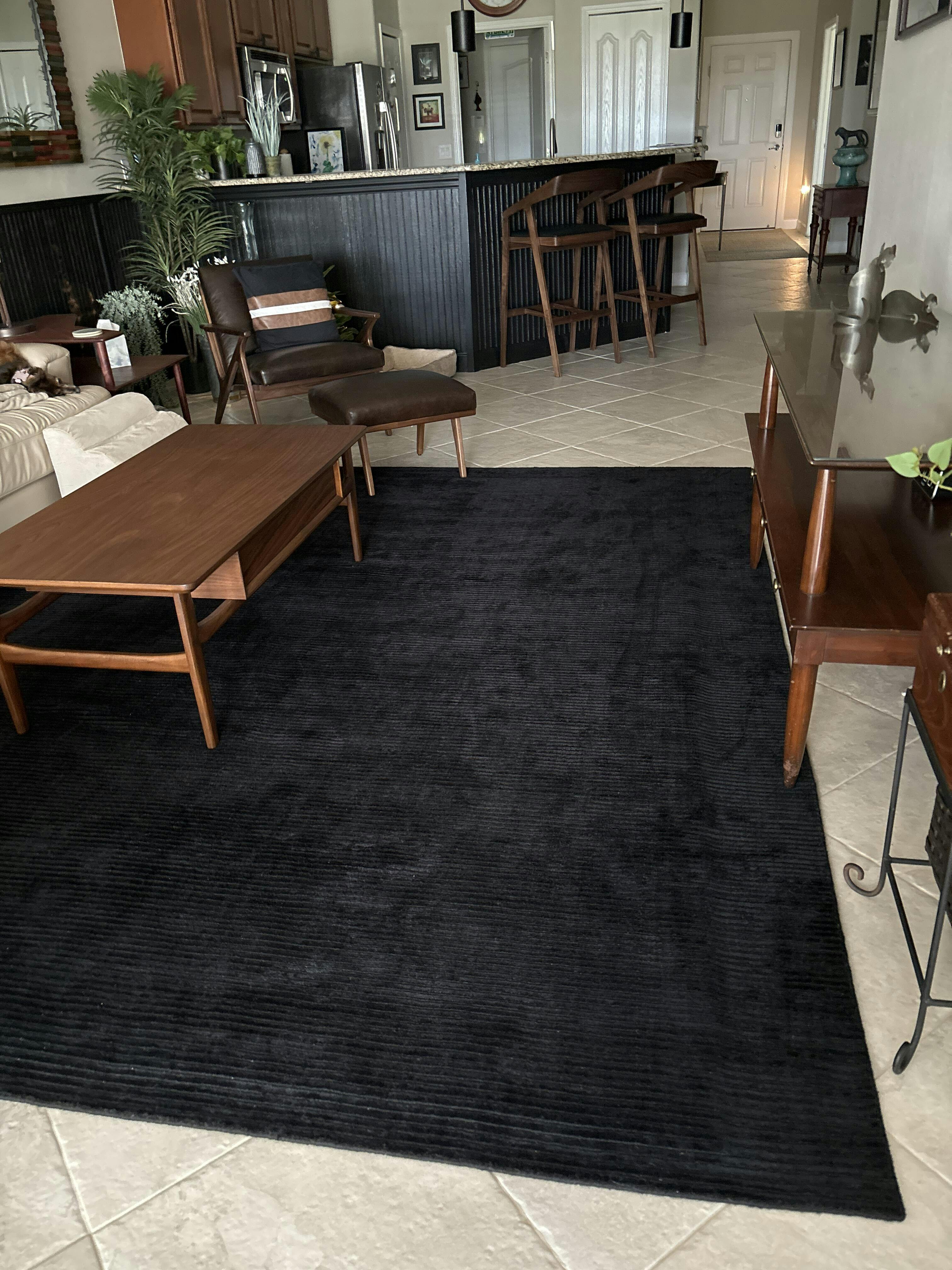 After looking in stores and almost all websites, I stumbled across this website. It seemed expensive for an unseen item but there is a return option. I had seen much less expensive rugs ( think cheap) but finally decided that “you get what you pay for”. The rug is 50 percent wool so it is a great heavy quality that feels good under foot. It was rolled upon receipt and rolled out nice and flat with terrific straight lines and right angle corners. Because of the quality, there were no issues with wrinkles. I like the simple lines with no fringe which always gets ratty. I have had the rug a little over a month and anticipate that it will hold up well. Thus far, I think it is superior without going to a financial extreme.