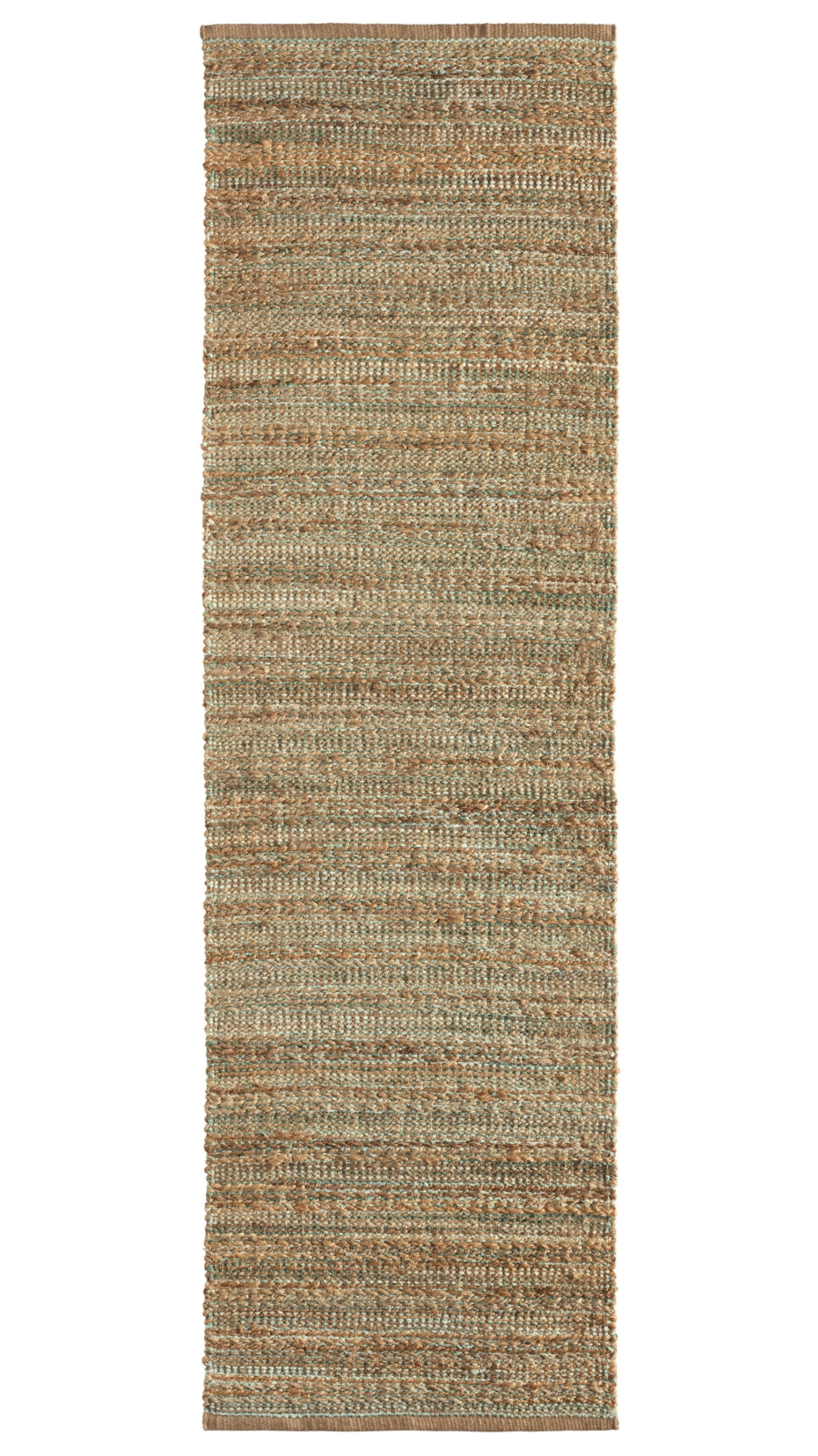 A natural area rug with a contemporary touch, this cotton-backed layer's golden beige tone and hints of green and pale blue striated accents make a cool, casual statement. The organic texture of the hand-woven rayon and jute fibers offers an intriguing feel and bohemian-inspired style.