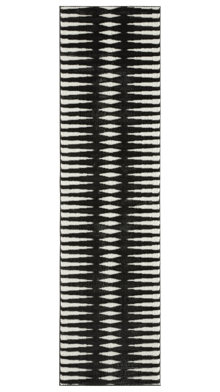 Modern geometrics and a lustrous sheen define the Calix Collection by Nikki Chu. The soft, plush pile features high and low areas for added texture that delights underfoot. The Apyre design showcases a black and white, diamond-striped pattern reminiscent of Zebra print. Polypropylene and polyester blend provides natural stain resistance and low maintenance care. This rug best suits medium-traffic spaces of the home, such as living rooms, bedrooms, and dining rooms.