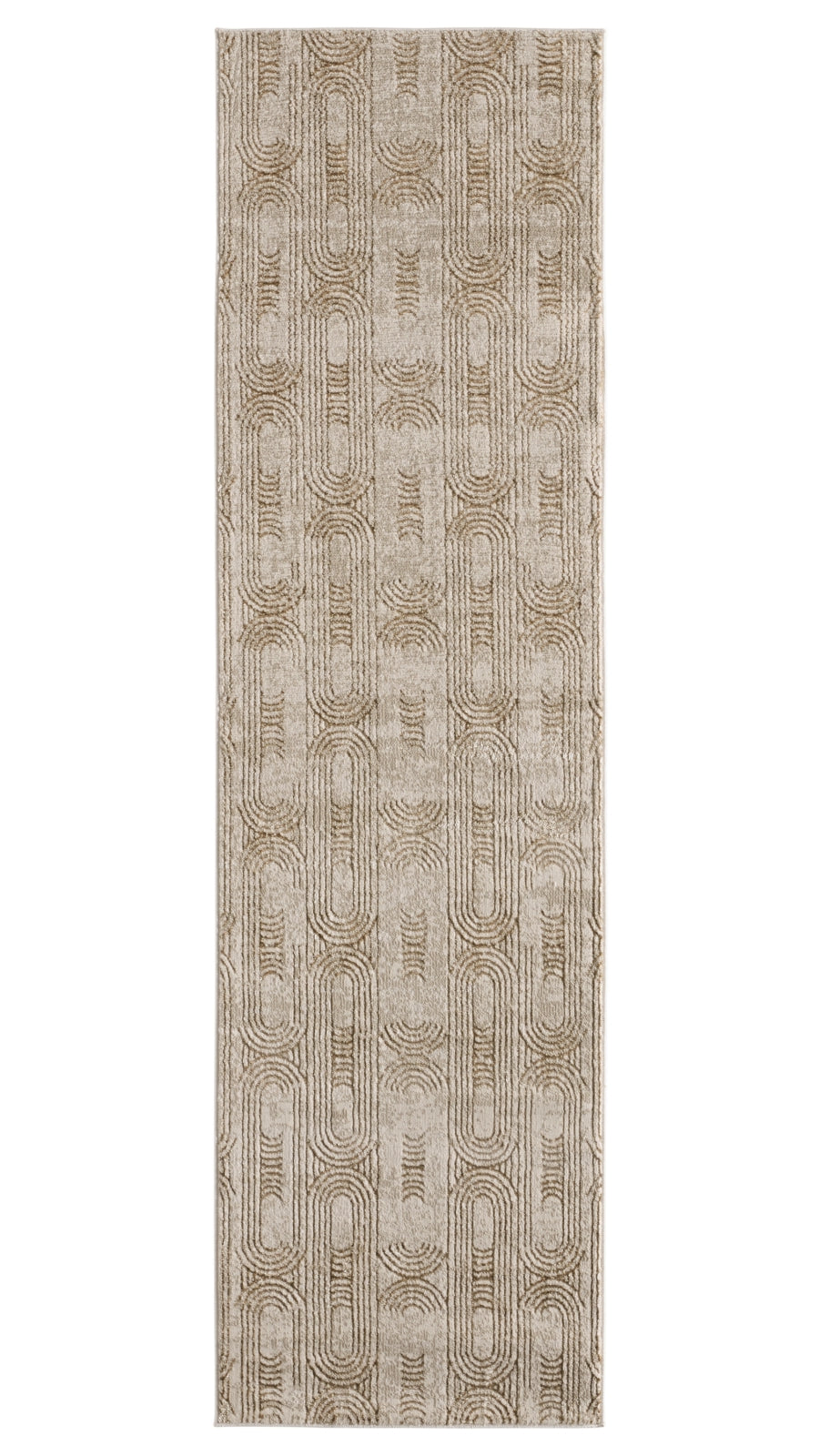 The show-stopping yet surprisingly versatile appeal of the Catalyst collection brings contemporary edge to any home. The distressed, geometric design of the Gimeas rug creates a dynamic and shimmering statement in tones of gold, beige, brown, light taupe, and cream. This power-loomed rug features metallic polyester fibers blended with stain-resistant polypropylene for a brilliant sheen from various perspectives. This area rug withstands high traffic areas of the home such as living rooms, halls, and entryways.