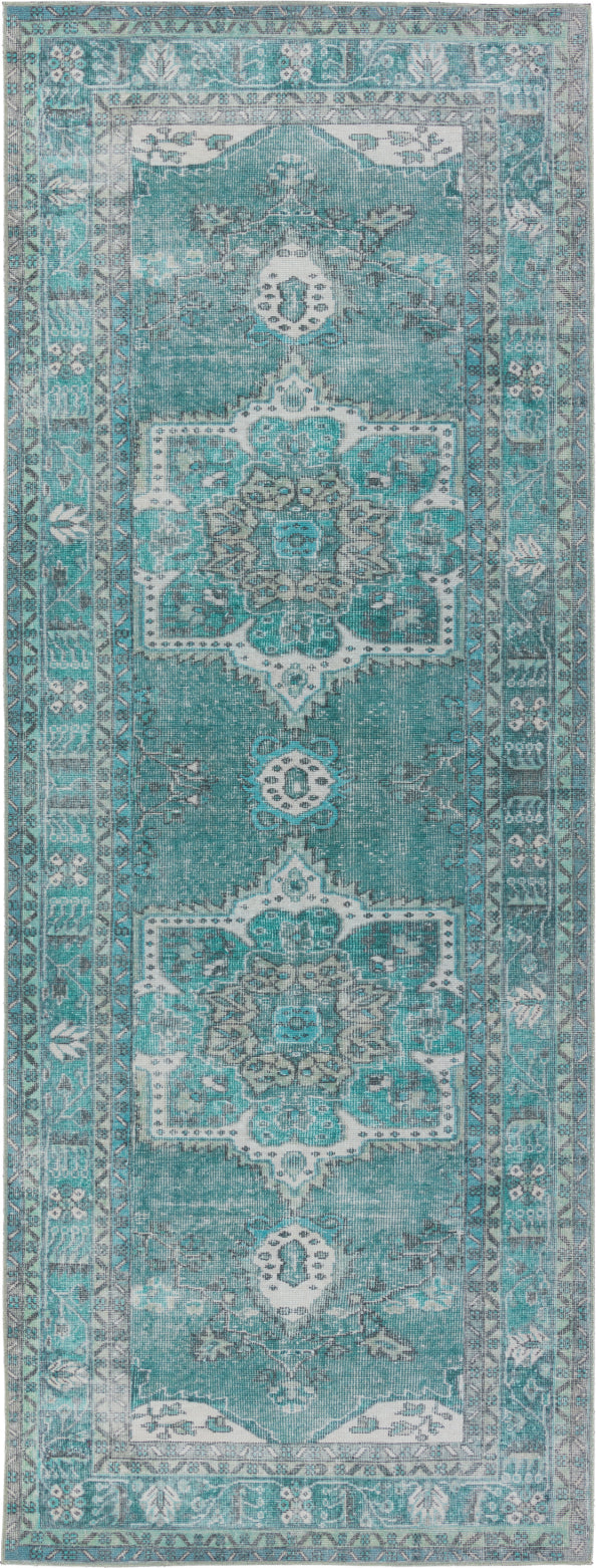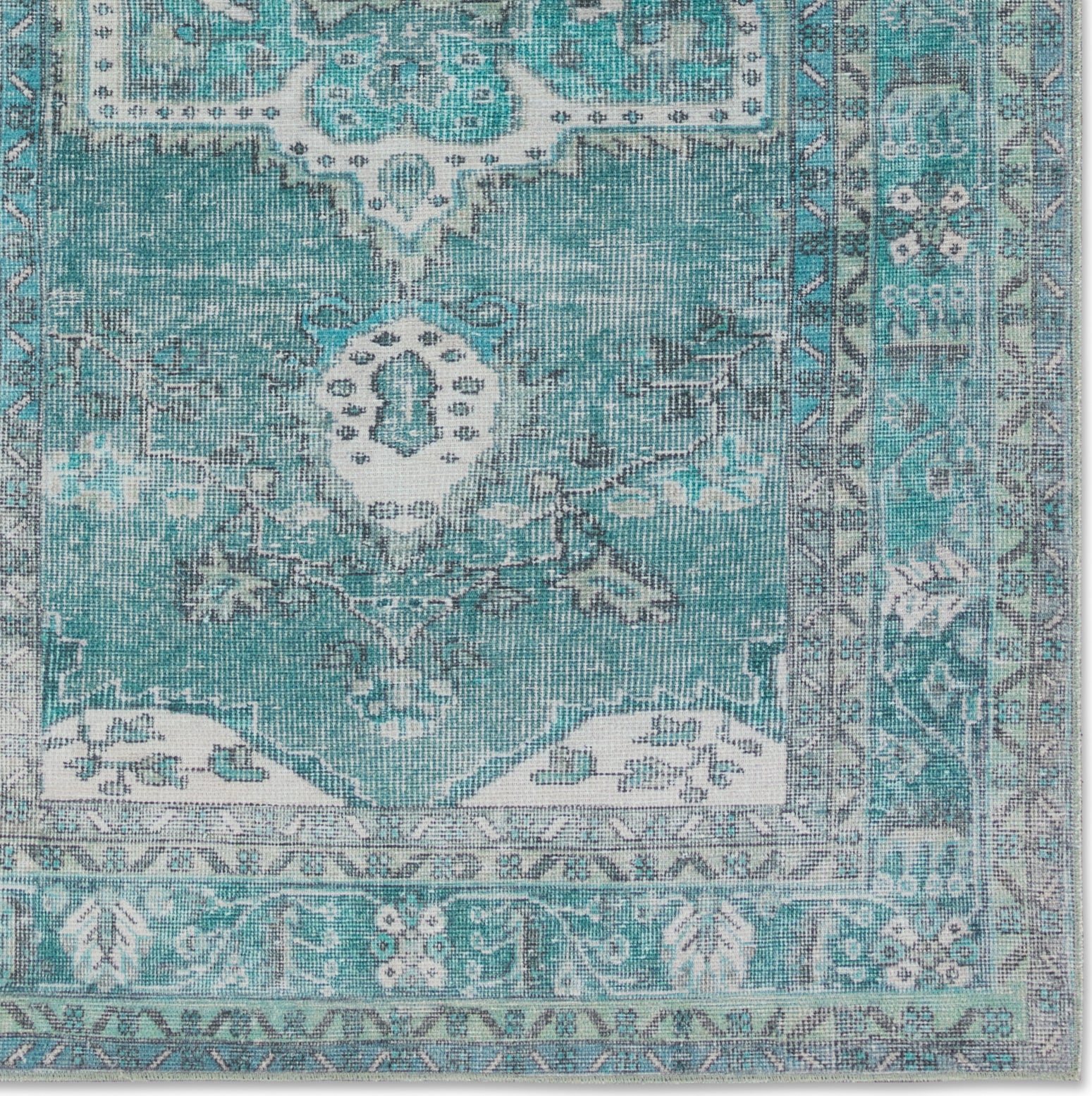 Inspired by well-traveled vintage designs, Kate Lester has joined with Jaipur Living to launch the Harman collection. This impressive assortment of antique textile designs lends heirloom-quality looks and livable style to any space. The Tamara area rug showcases a vibrant medallion pattern emphasized by hues of turquoise, cream, and pastel green. This digitally printed rug boasts a perfectly distressed effect for effortless charm that is matched with a traction backing perfectly suited for heavily trafficked, hard surface spaces such as entryways, bathrooms, and kitchens.