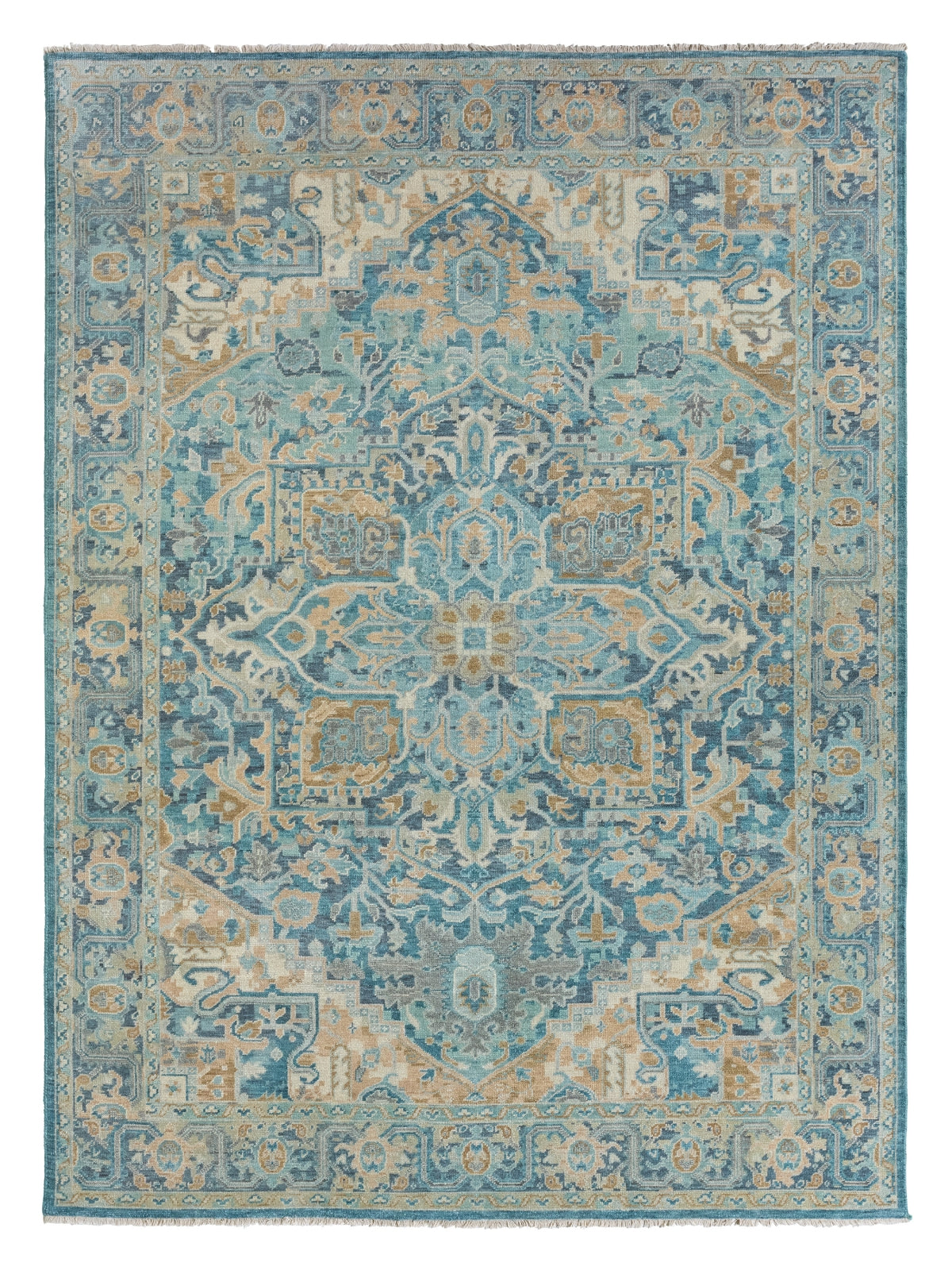 The entrancing Inspirit collection marries globally inspired patterns with magical color palettes. The hand-knotted Elyas area rug features a contemporary colorway of sky blue, golden tan, and ivory for an inviting accent in living spaces. Crafted of durable wool, this ornate rug showcases a center star medallion and elegant floral details.