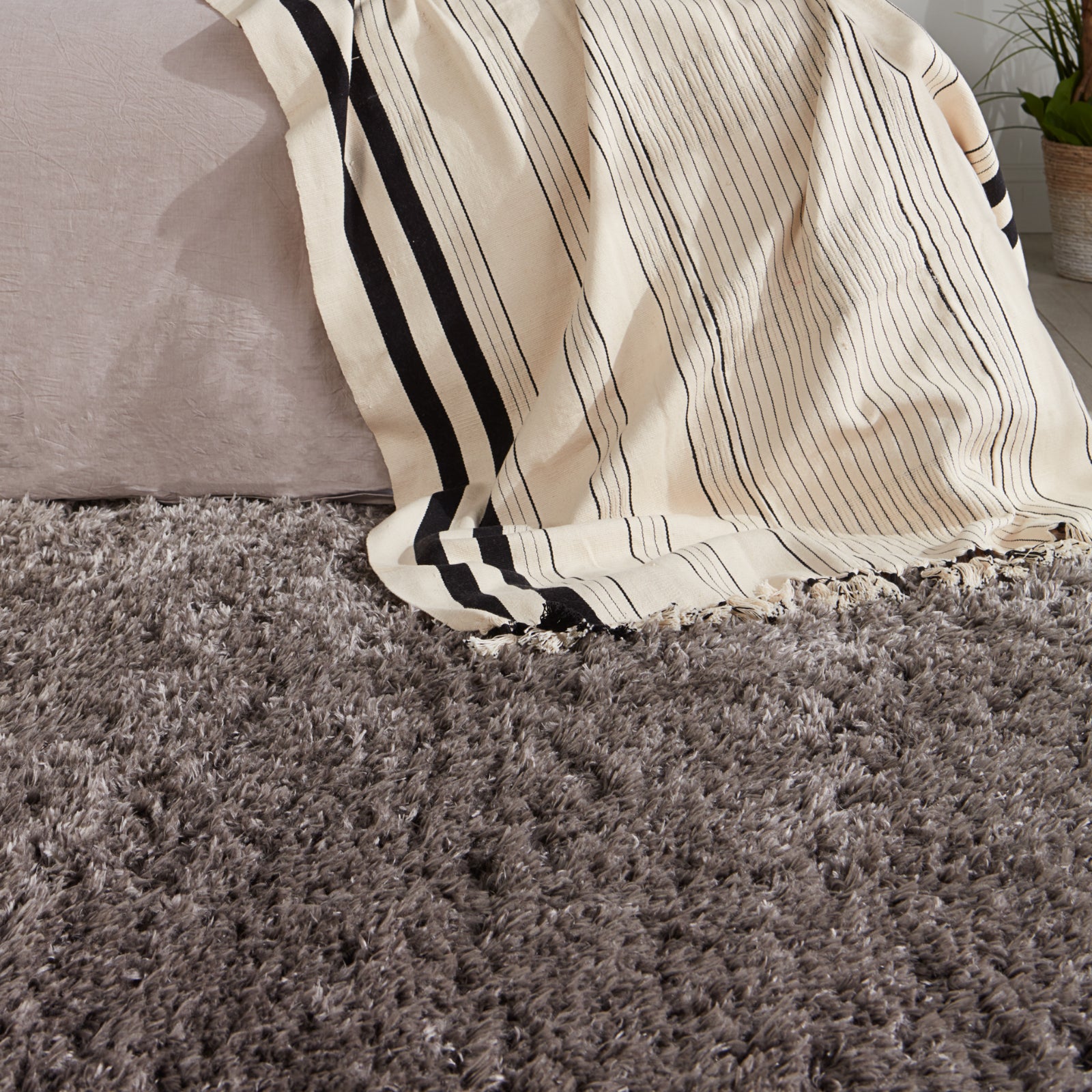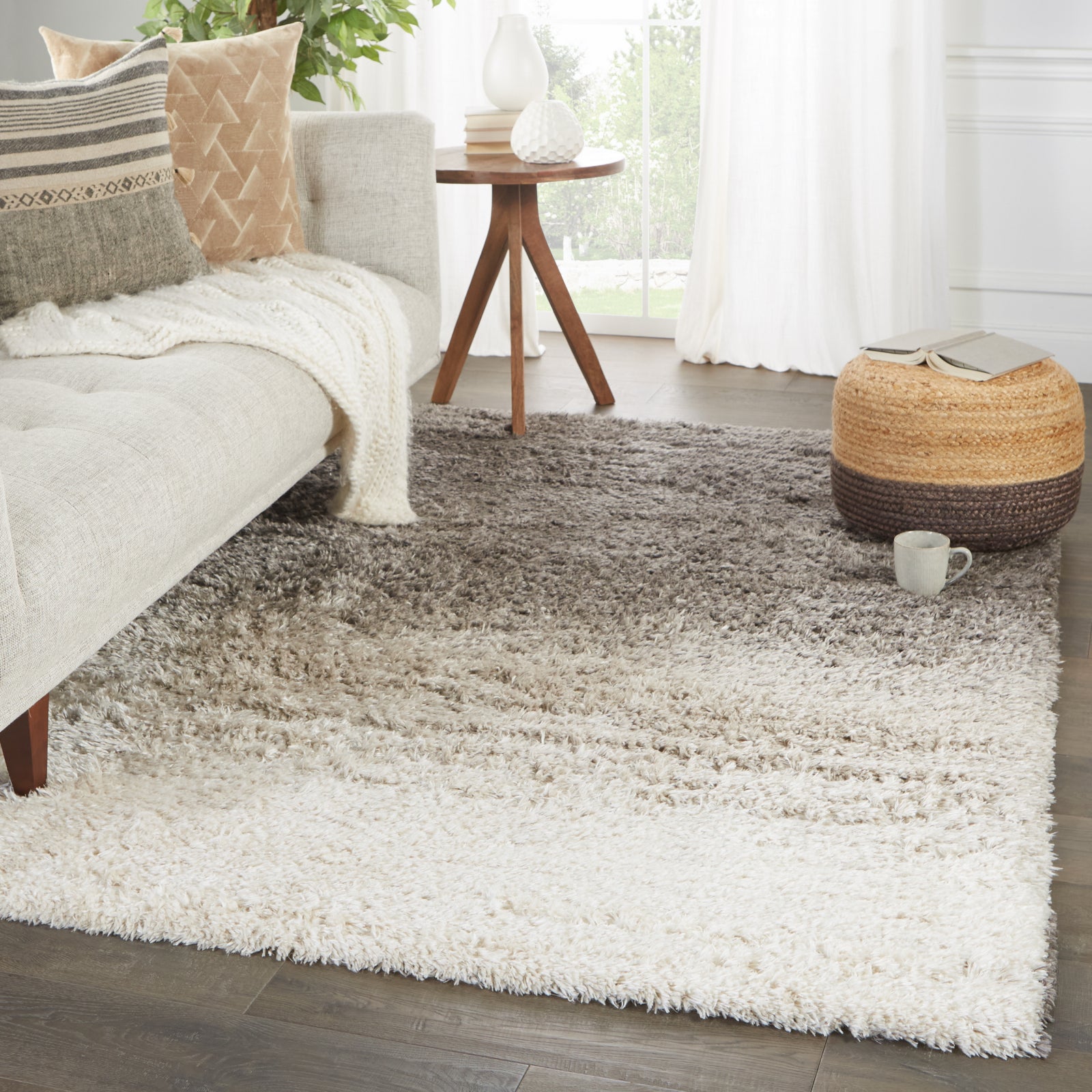 Plush and inviting, the shaggy Izara collection melds modern appeal and a chic neutrality. The Jola area rug is a wonderful accent of texture and subtle color variation in any space, grounding the room with an ombre design that fades from versatile gray to cream. Power loomed of durable and virtually shed-free polyester, this lustrous rug boasts an incredibly soft and indulgent feel.