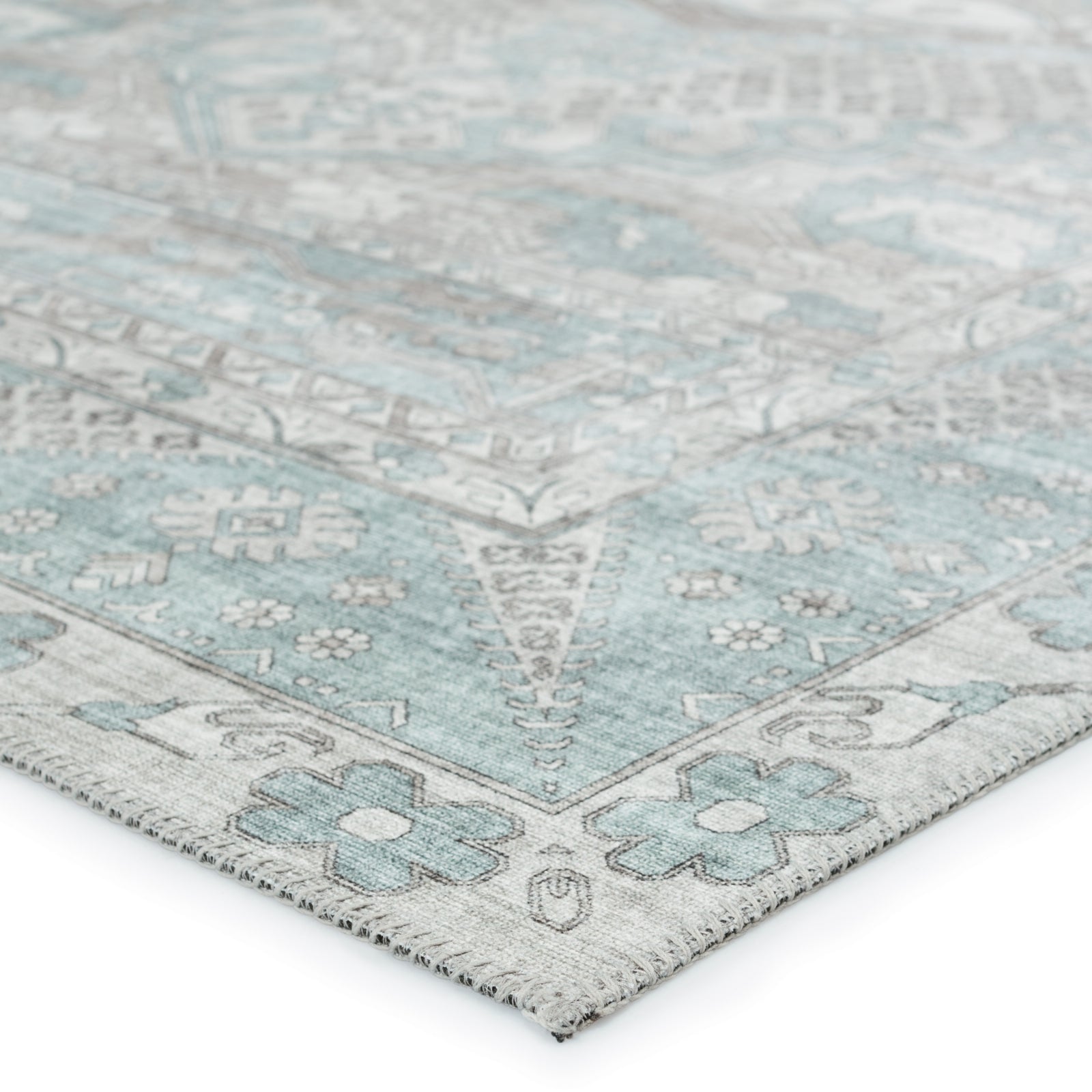 The Keyara collection by Nikki Chu melds the timelessness of vintage designs with fresh, global style. The Issa rug showcases a beautifully faded medallion motif with floral details and an elegantly subdued colorway of light blue, gray, and ivory. This low-profile rug is made of soft polyester and features vibrant and artistically distressed digitally printed design.
