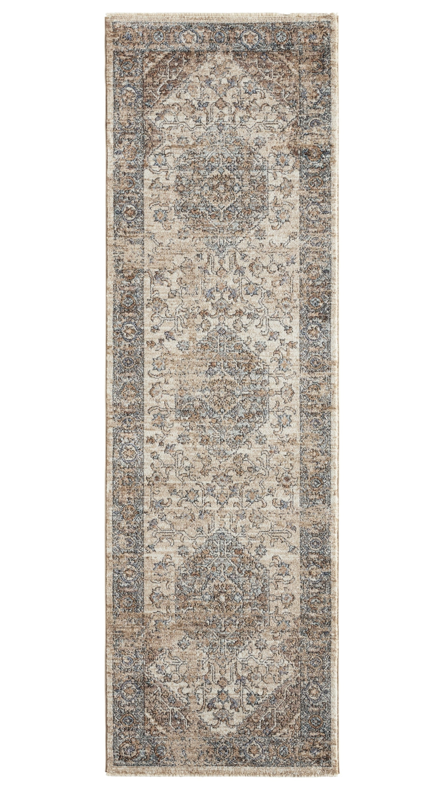 Inspired by the distressed perfection of antique textiles, the Lark collection is warm and inviting with rich, updated hues. The updated traditional Heir area rug showcases an intricate medallion and border design paired with short, cream fringe. The floral details spring to life in hues of beige, blue, cream, orange, light brown, and hints of gray. This indoor rug thrives in high and low trafficked areas of the home such as living rooms, halls, entryways, bedrooms, and dining areas.