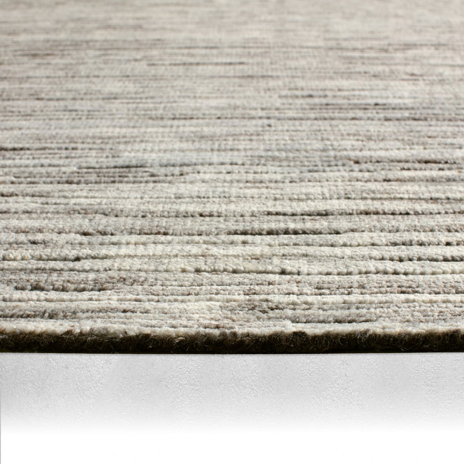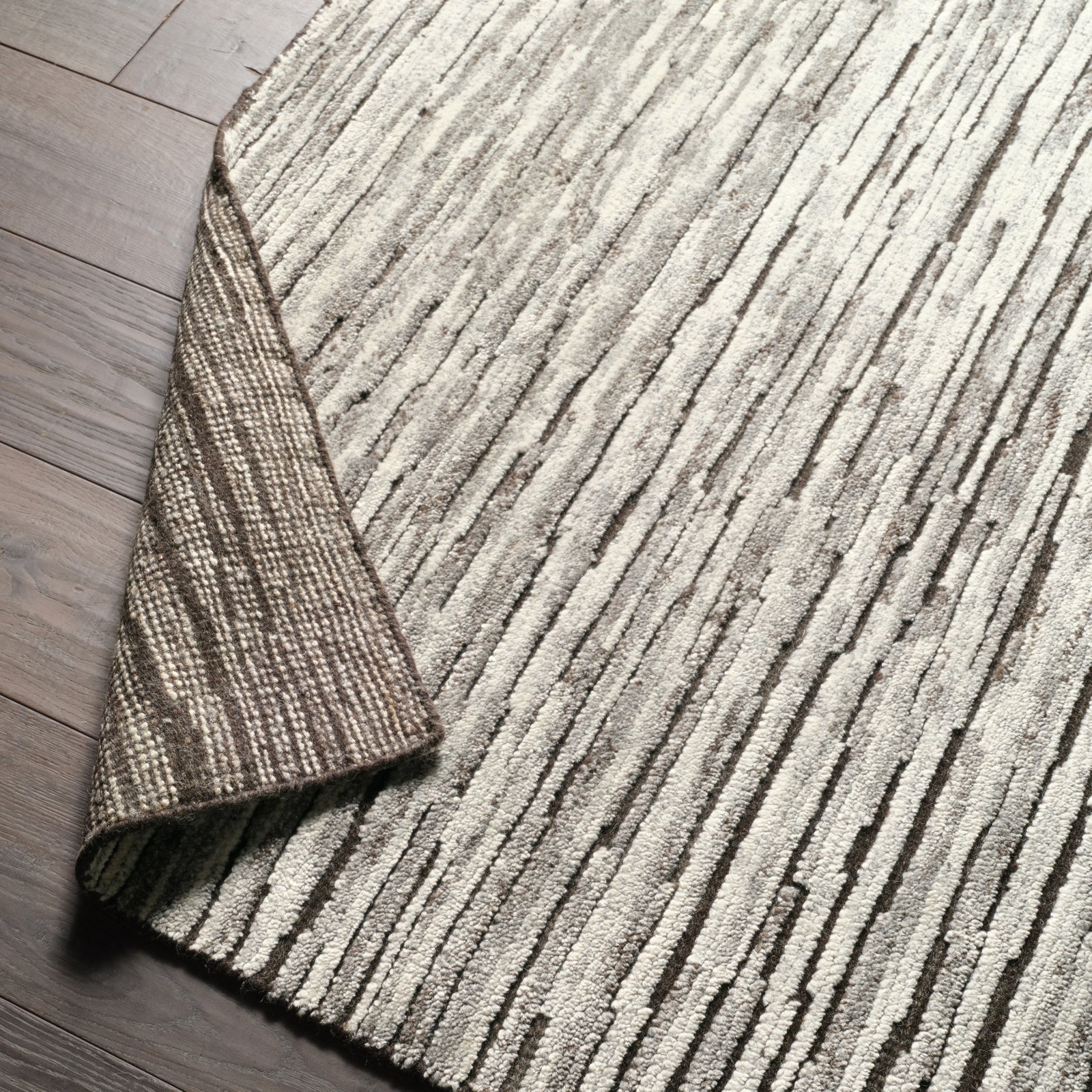 The captivating Reign collection introduces detail-rich design and inviting high-low pile to contemporary and traditional homes alike. Hand knotted by skilled artisans, the Ramsay wool rug creates depth and dimension with a cozy deep brown, gray, and ivory palette. Subtle ridges created by the organic linear pattern offer soft, tempting texture to this modern rug.