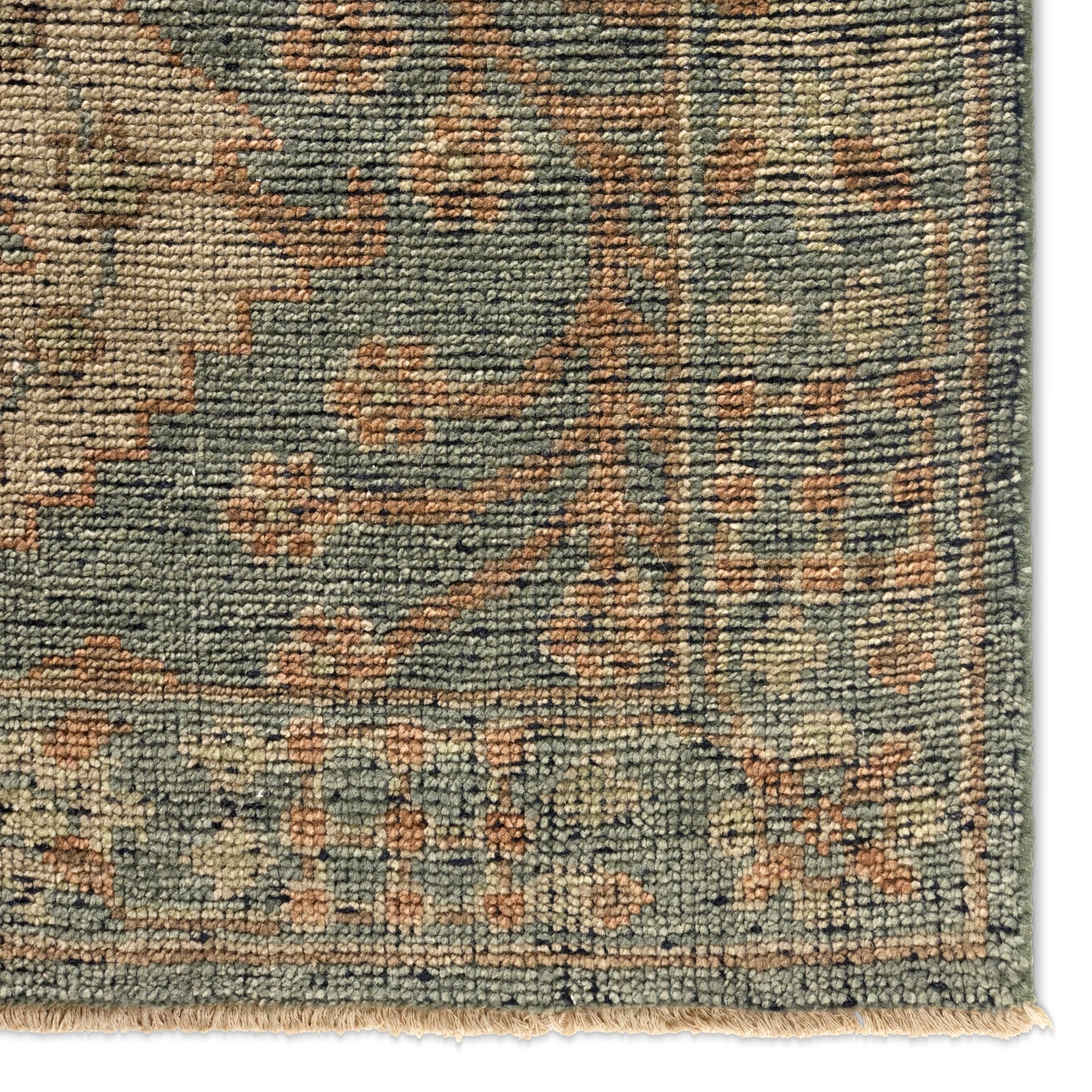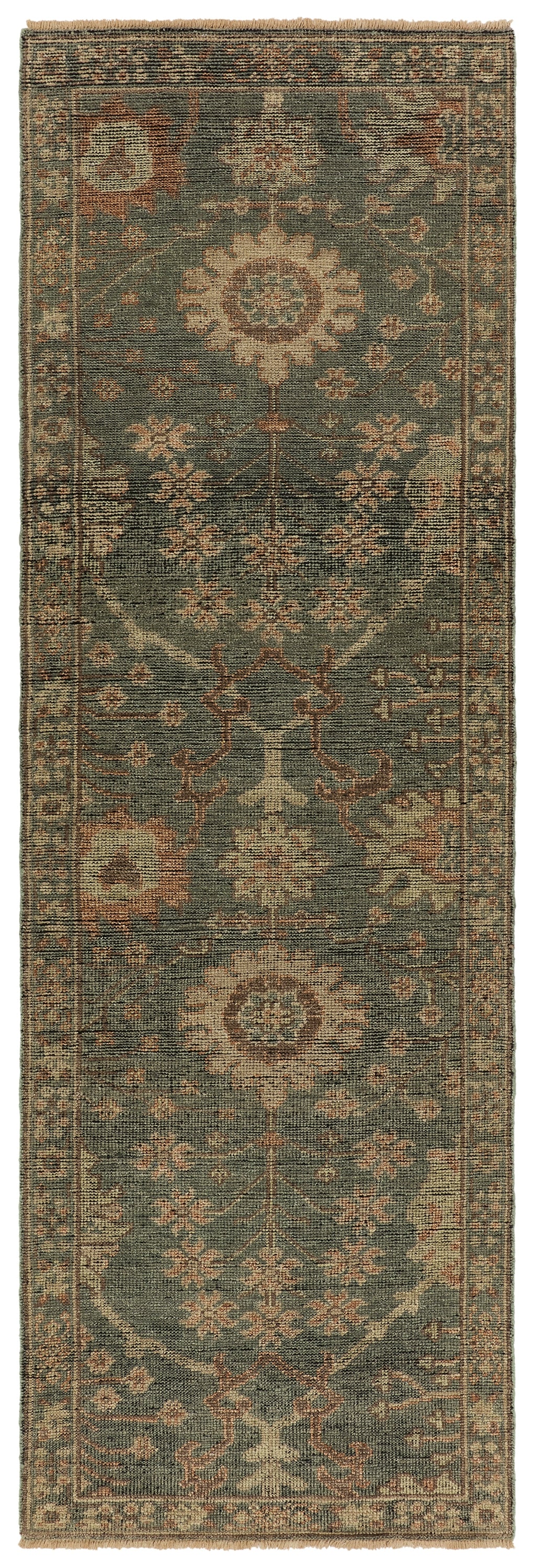 The Rhapsody collection features heirloom-quality designs of stunningly abrashed Old World patterns. The Maeli area rug showcases a distressed Oushak-inspired motif in rich, earthy hues of gray-green, tan, and beige. This durable wool handknot anchors living spaces with a fresh take on vintage style.