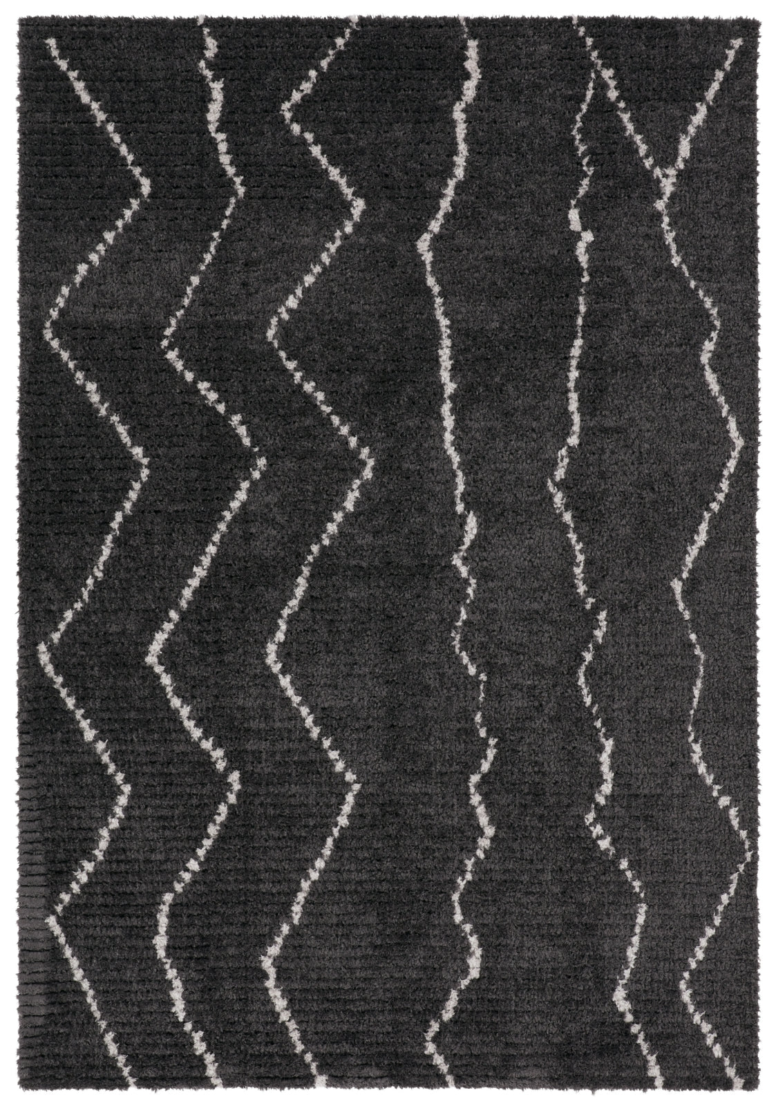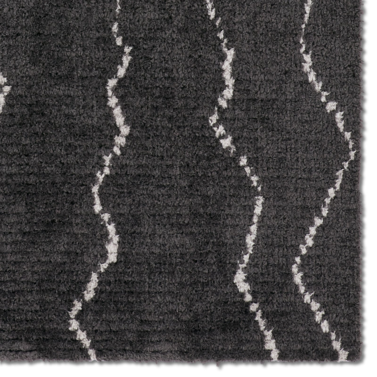 Traditional Moroccan motifs, but make them modern. Powerloomed, with a hand knotted look, this exquisite rug offers slender light gray lines on a dark gray base-complete with a lustrous sheen. Striking yet simple, this medium-traffic rug is indulgent on the eyes and underfoot.