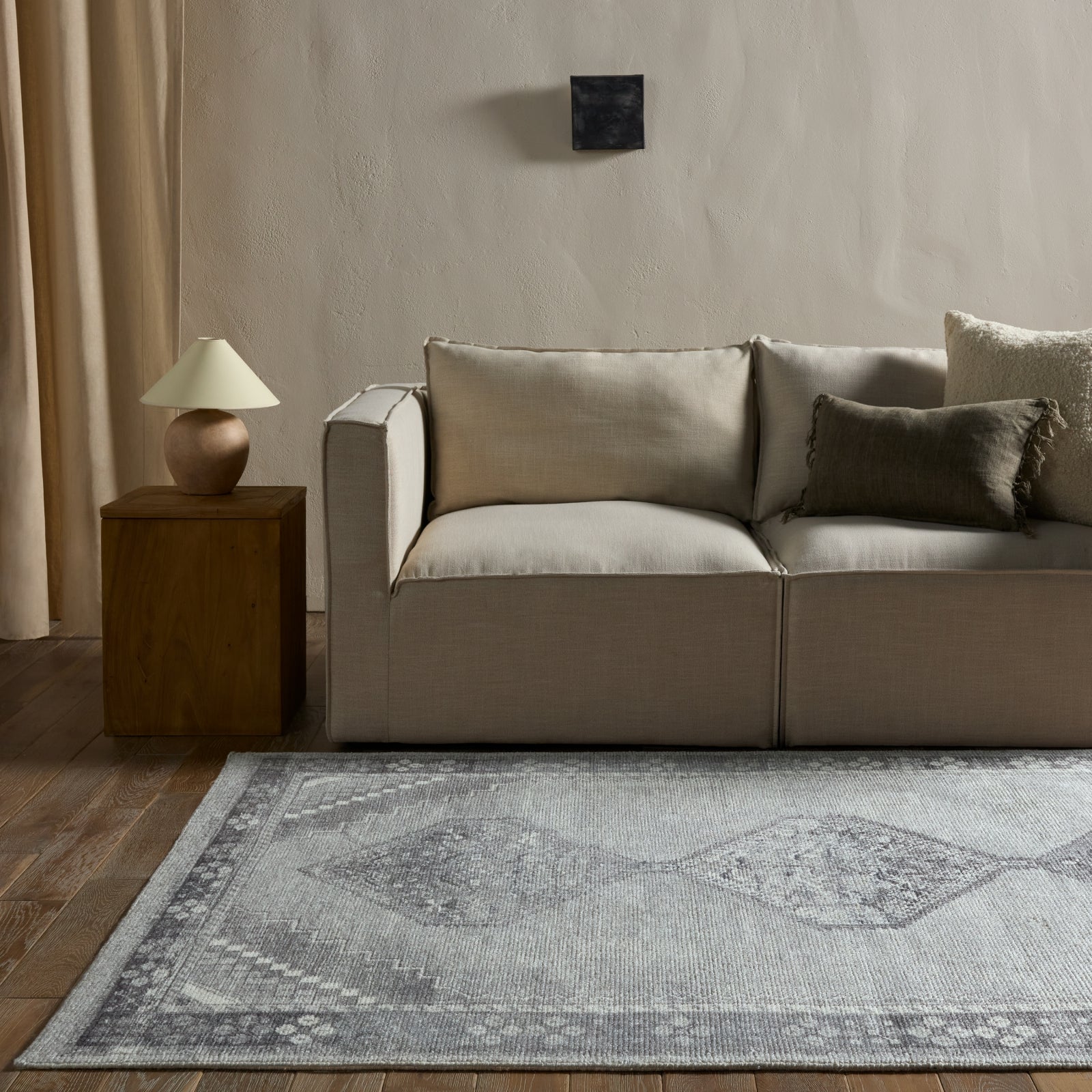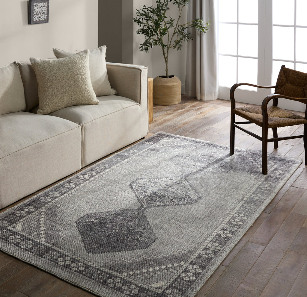 Nostalgic medallion motifs with a modern reinterpretation. The Theo collection features a vintage-inspired design complemented by rich yet distressed shades of blue and gray. A digital print is layered on a handwoven base, offering durability and easy care-with a luxe, high-end look.