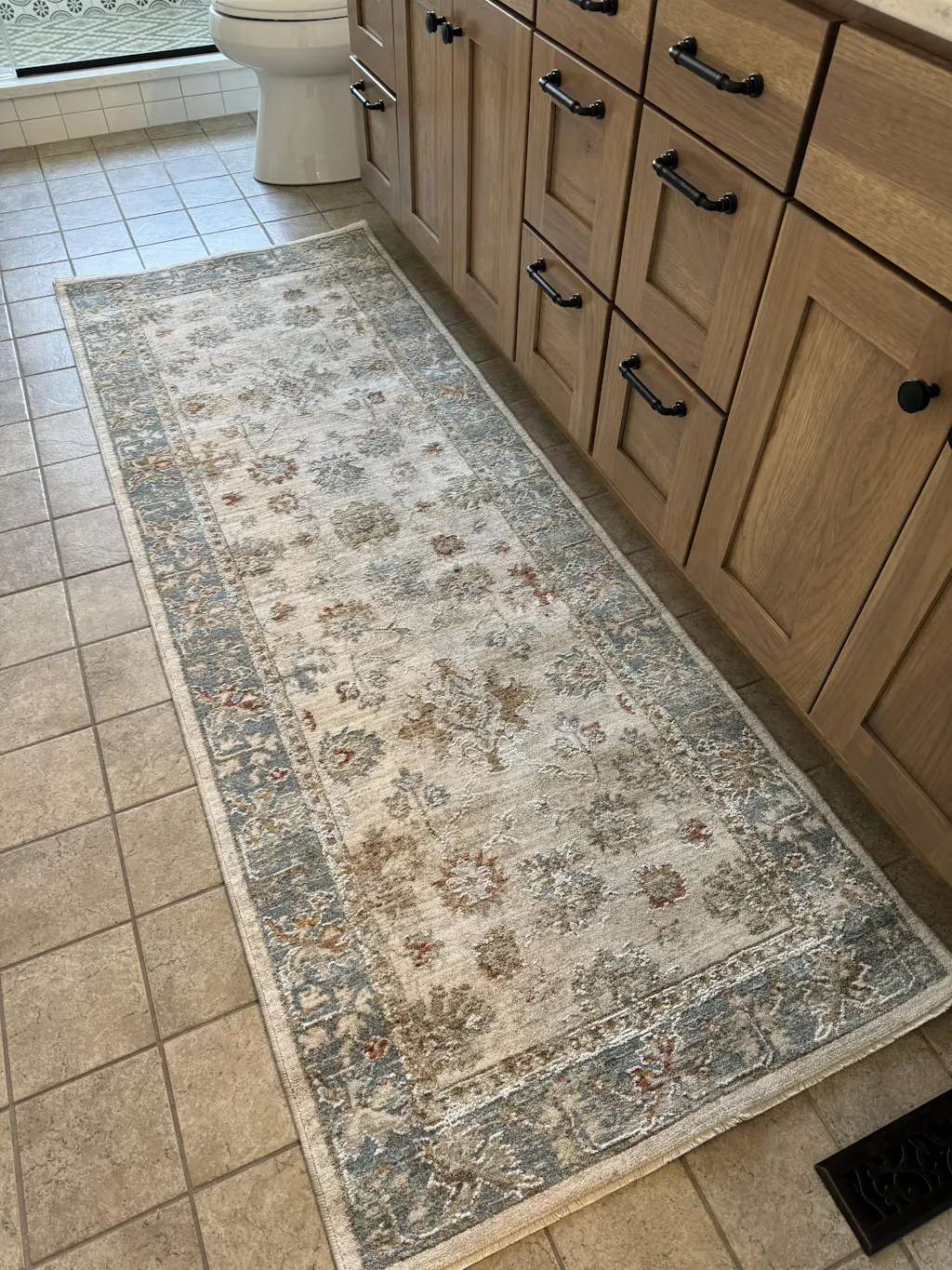 The rug is gorgeous. The colors as described and looks great on my new bathroom.