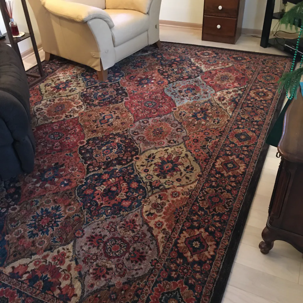 I purchased this rug for my entryway. The order was processed quickly and the rug arrived fast and undamaged. The colors in the photo are fairly accurate. Nice thickness and soft to the touch. I’m happy! So is Louie! I have a 20+ yr old wool Karastan rug. I hope this one holds up as well as that one! I’ve been looking for an a vintage wool rug for my living room but I think I may just order another one of these Karastans from Incredible Rugs!