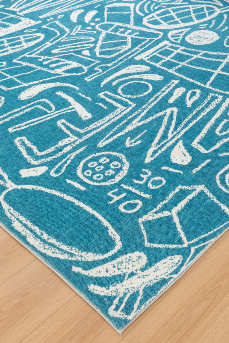 Noted mural artist Katie Merz has created a delightful sports-themed rug collection that depicts her highly distinctive glyph-art style. The artist's spontaneous and wildly oriented hieroglyphs are densely sandwiched together to illustrate the various images, icons, actions, language, energy and essence of a number of today's most popular sports. Power-loomed using 100% polyester yarns.