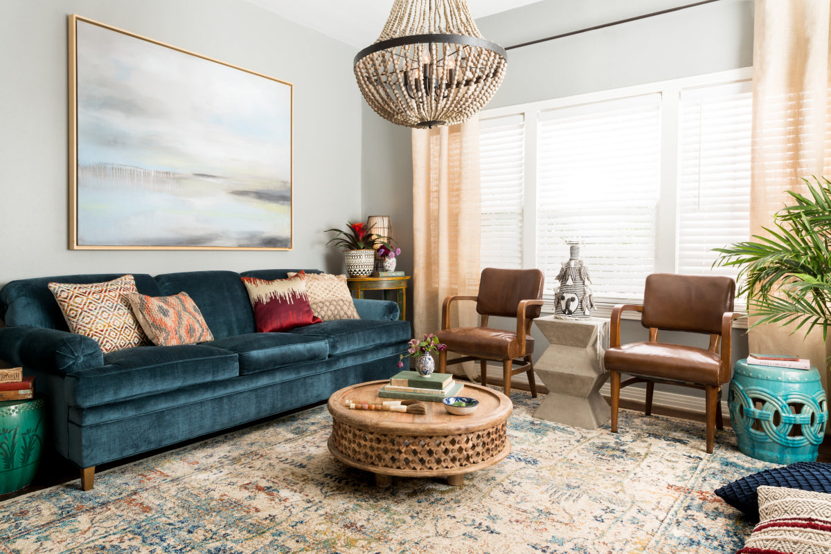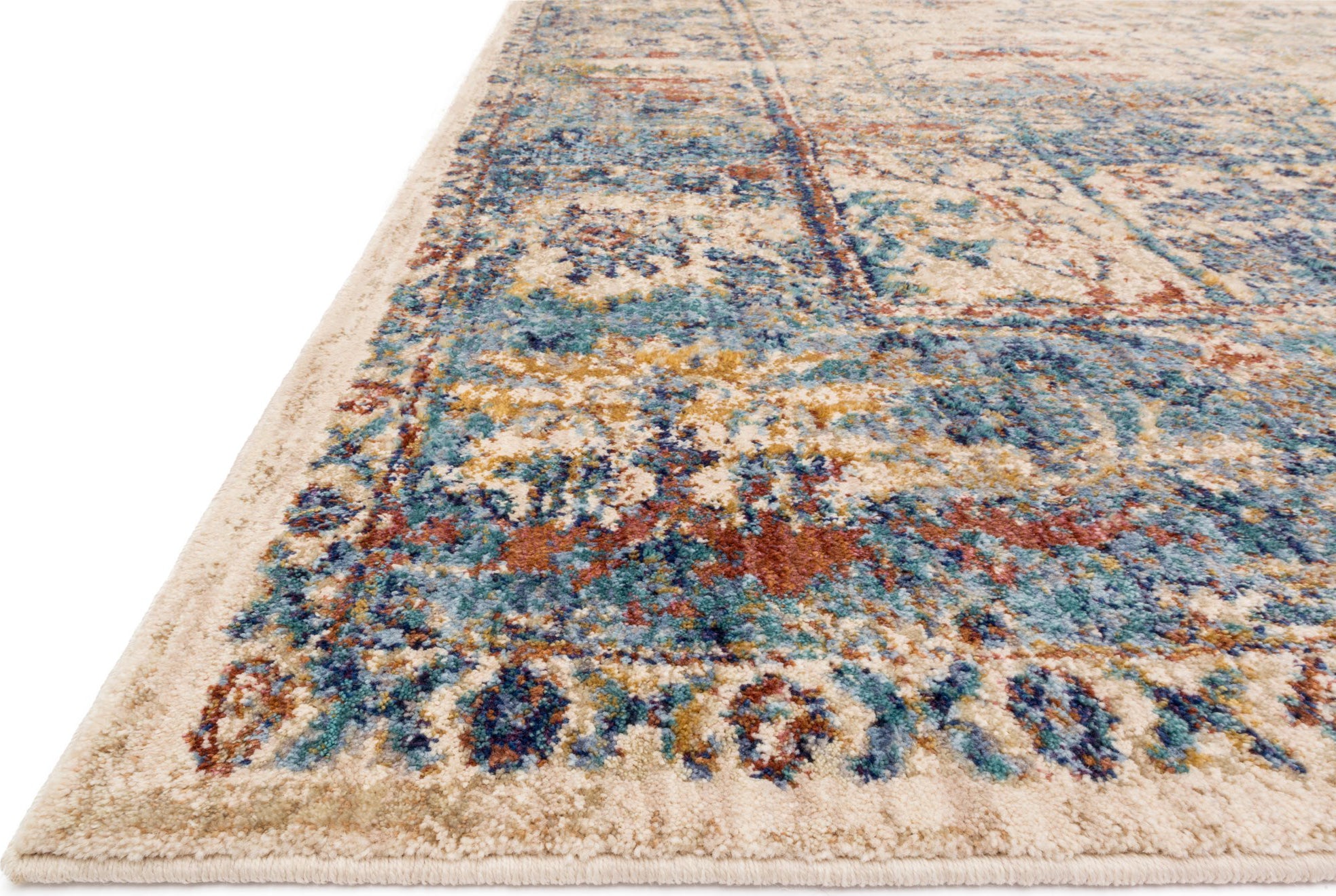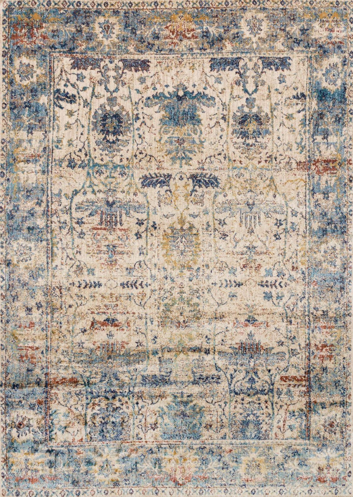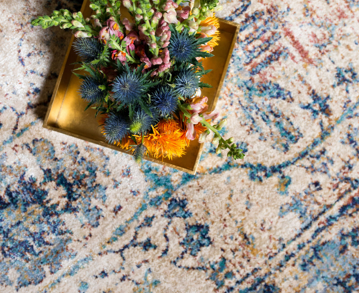 I wanted to bring more light in to our living room. I tried a couple other rugs and the quality and color wasn't right. This rug has a gorgeous ivory sand background with muted medium and indigo blues, gray, a muted berry-rust-red, and taupe colors. It works perfectly for what I was trying to achieve. It's soft and looks durable. Plus it's huge at 9.6x13.6.... I love it.